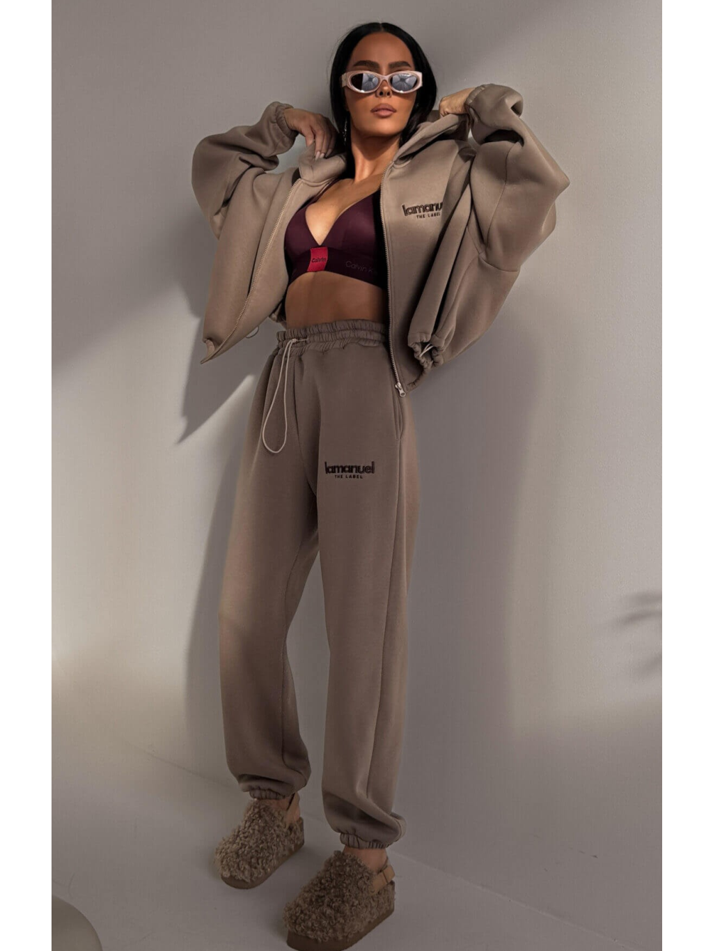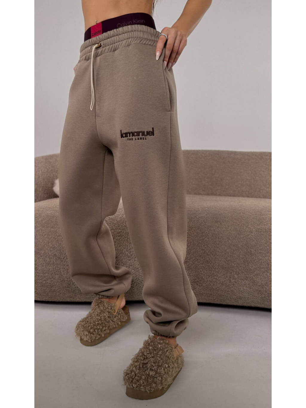 Nadměrné kalhoty CREAMY LAMANUEL z poškrábané jsou naprostý pohodový profesionál – silnější materiál uvnitř je měkký "plyšový medvídek", který se zabaluje jako deka, ale nevypadá jako pyžamo, spíš jako promyšlený street look, mají vysoký pas s elastickým páskem, volné nohavice a logo LAMANUEL, které plní svůj účel a dodává detail, který hned říká: Nejsou to obyčejné teplákové soupravy, jsou to teplákové soupravy s charakterem.