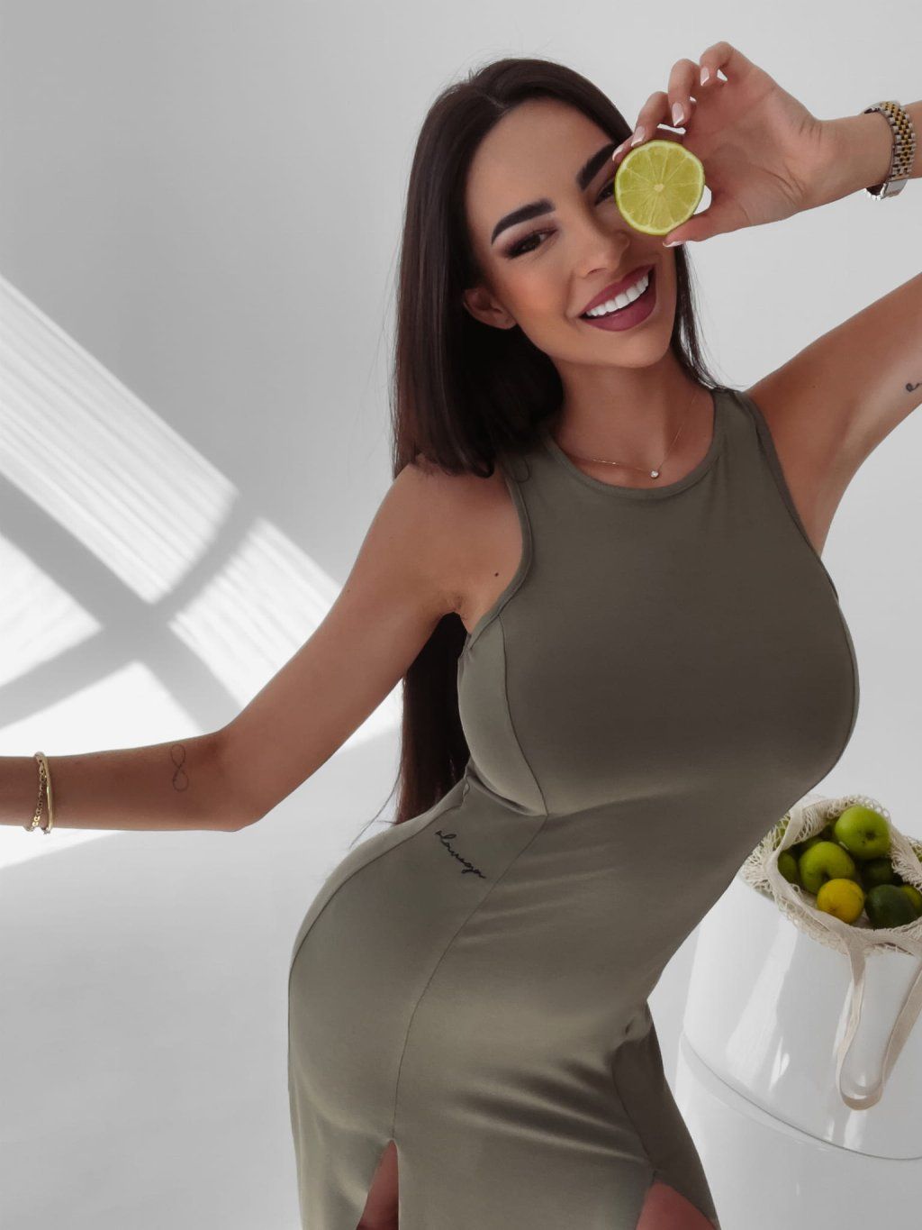 Přiléhavé maxi šaty bez rukávů s hlubokým dvojitým bočním rozparkem. Jednoduchý střih z hladké, pružné látky. Vysoký kulatý výstřih zdůrazňuje postavu. Ideální na letní procházku, na pláž nebo na grilování s přáteli.