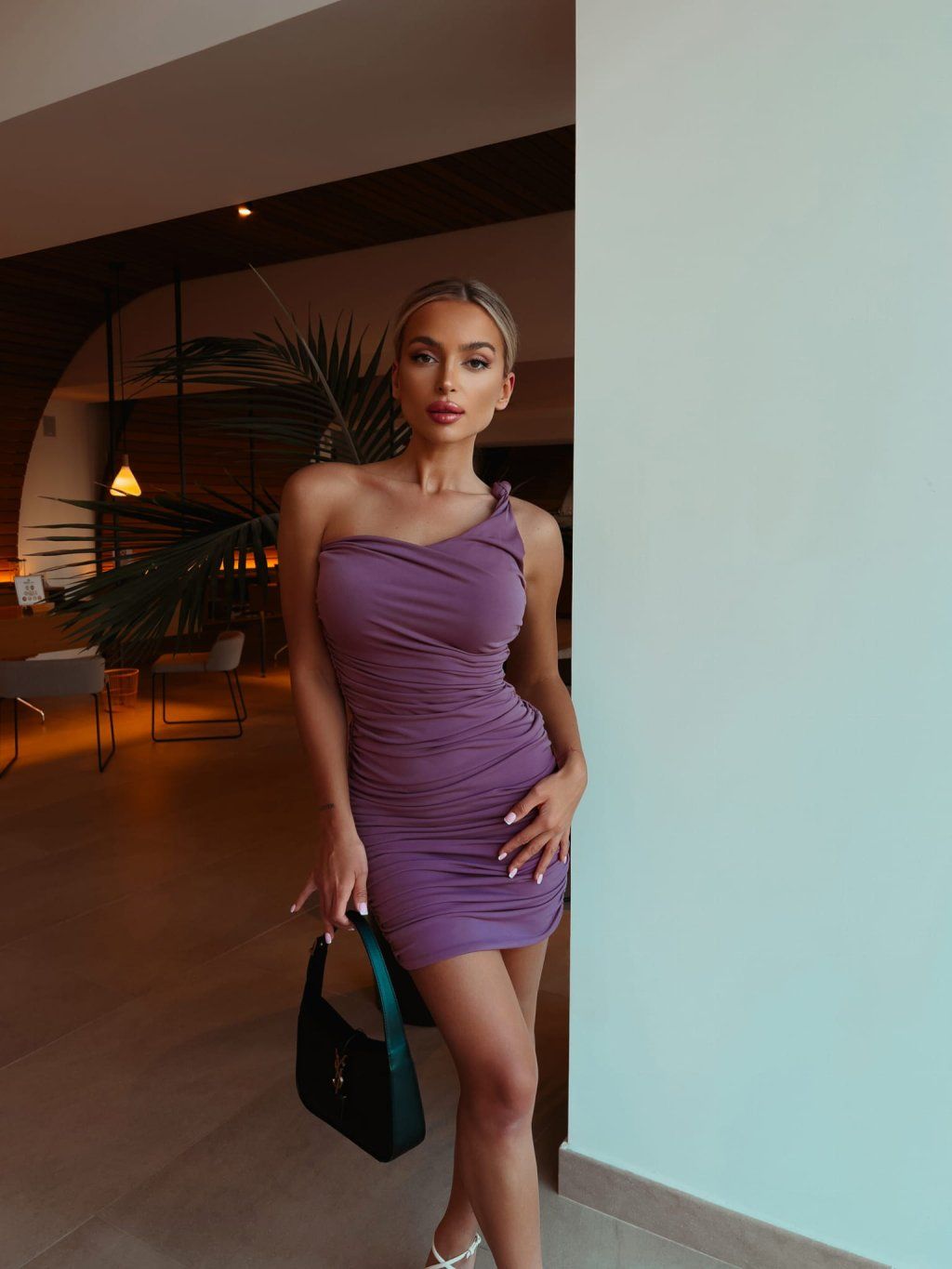 Přiléhavé, decentní a ženské asymetrické minišaty na jedno rameno. Volány zdůrazňují siluetu a zakrývají nedokonalosti. Tyto šaty jsou ideální na svatby nebo letní zahradní párty.