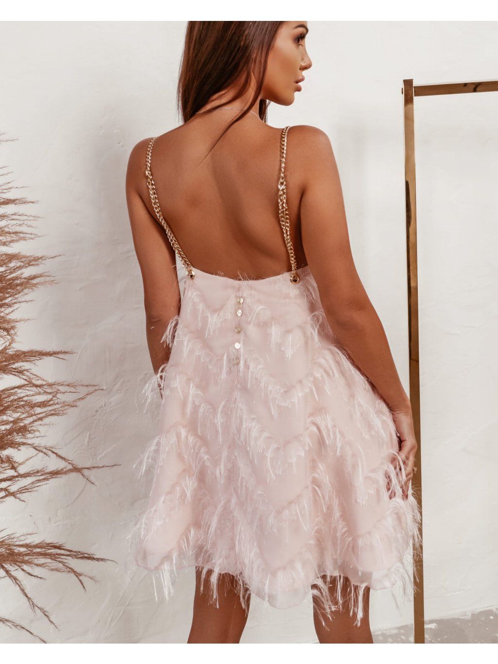 Lehké růžové šaty s peřím