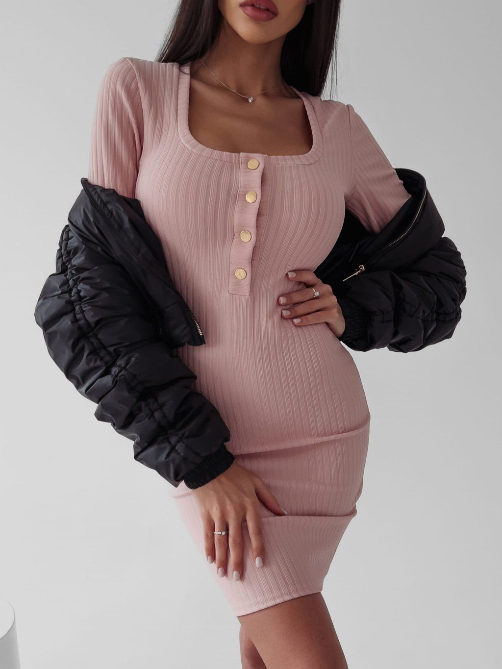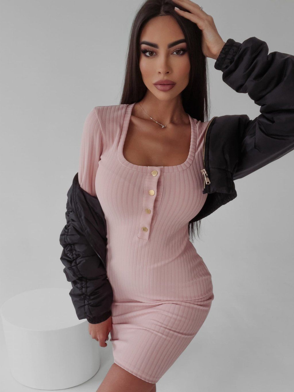Přiléhavé šaty z žebrovaného úpletu, které dokonale zdůrazní ženské křivky. Jsou dlouhé po kolena, mají dlouhý rukáv a rovný výstřih, který se zapíná na zlaté knoflíky s reliéfním logem. V závislosti na náladě nebo zvolených botách si je můžete vzít do práce nebo na rande.