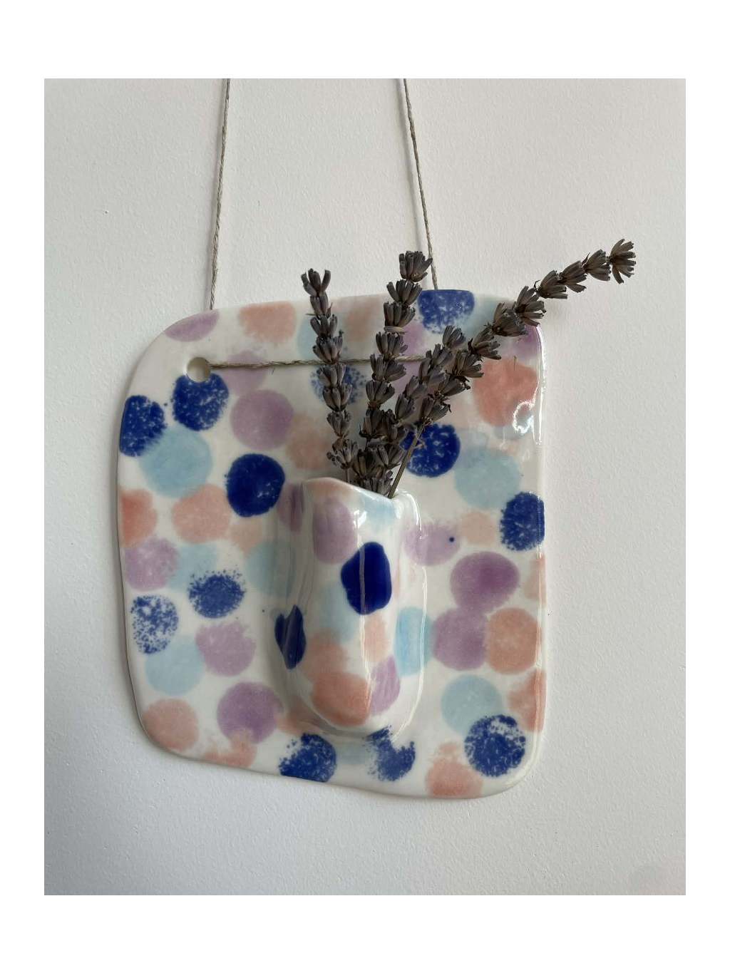 Přední strana má konvexní, organicky modelovanou kapsu, určenou pro jednotlivé větvičky, sušené květiny nebo malé rostliny. Její povrch je také pokryt jemnými barevnými cákanci, které harmonicky splývají s pozadím.