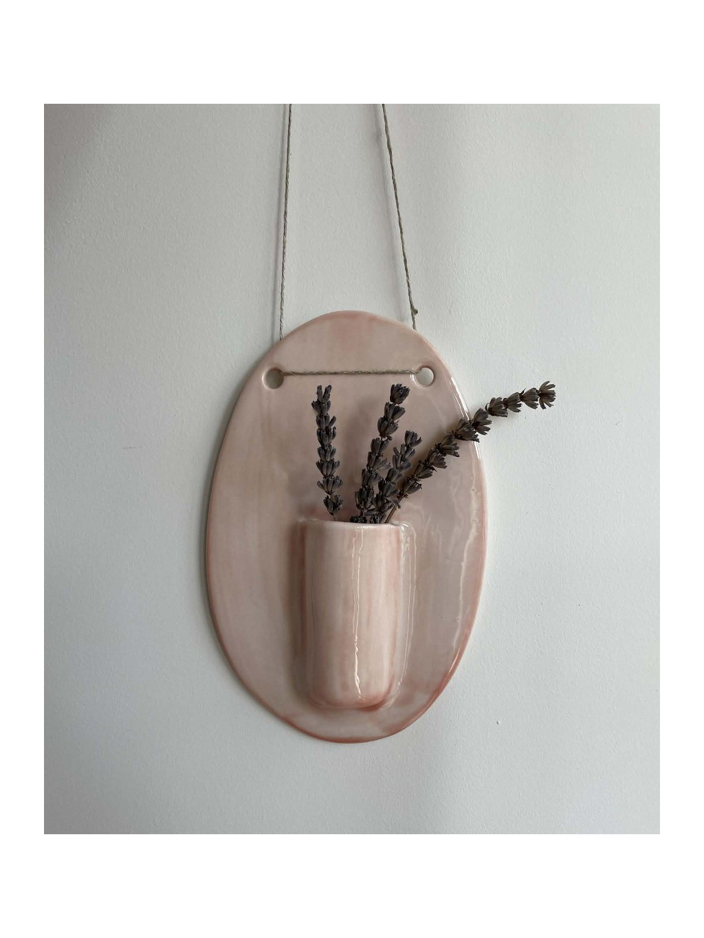 ákladnou je oválný talíř s jemně zaoblenými hranami. Jeho vršek má dva otvory provlečené přírodní šňůrkou, které umožňují snadné zavěšení na zeď. Ze středu talíře vystupuje malá, štíhlá kapsička – váza určená pro jednotlivé větvičky, sušené květiny nebo malá rostlinná aranžmá.