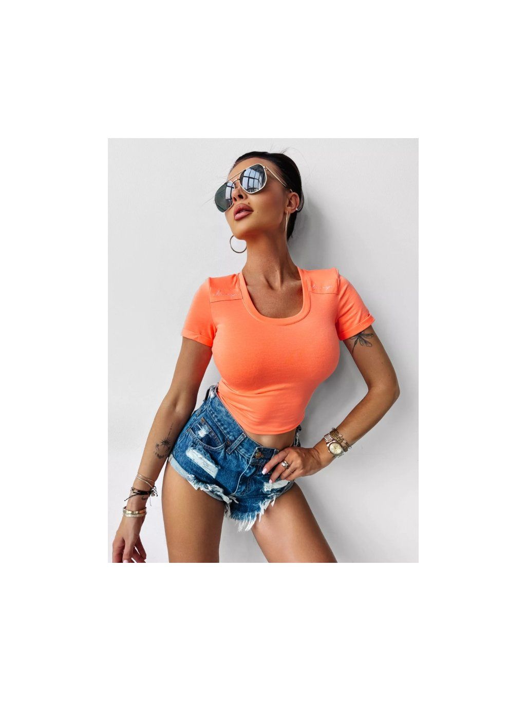 Přiléhavé tričko s krátkými rukávy a hlubokým výstřihem. Je vyrobeno z vynikající elastické bavlněné tkaniny. Vložky na ramenou pro větší eleganci. Ozdobné aplikace na přední straně s psaným logem značky OLAVOGA.