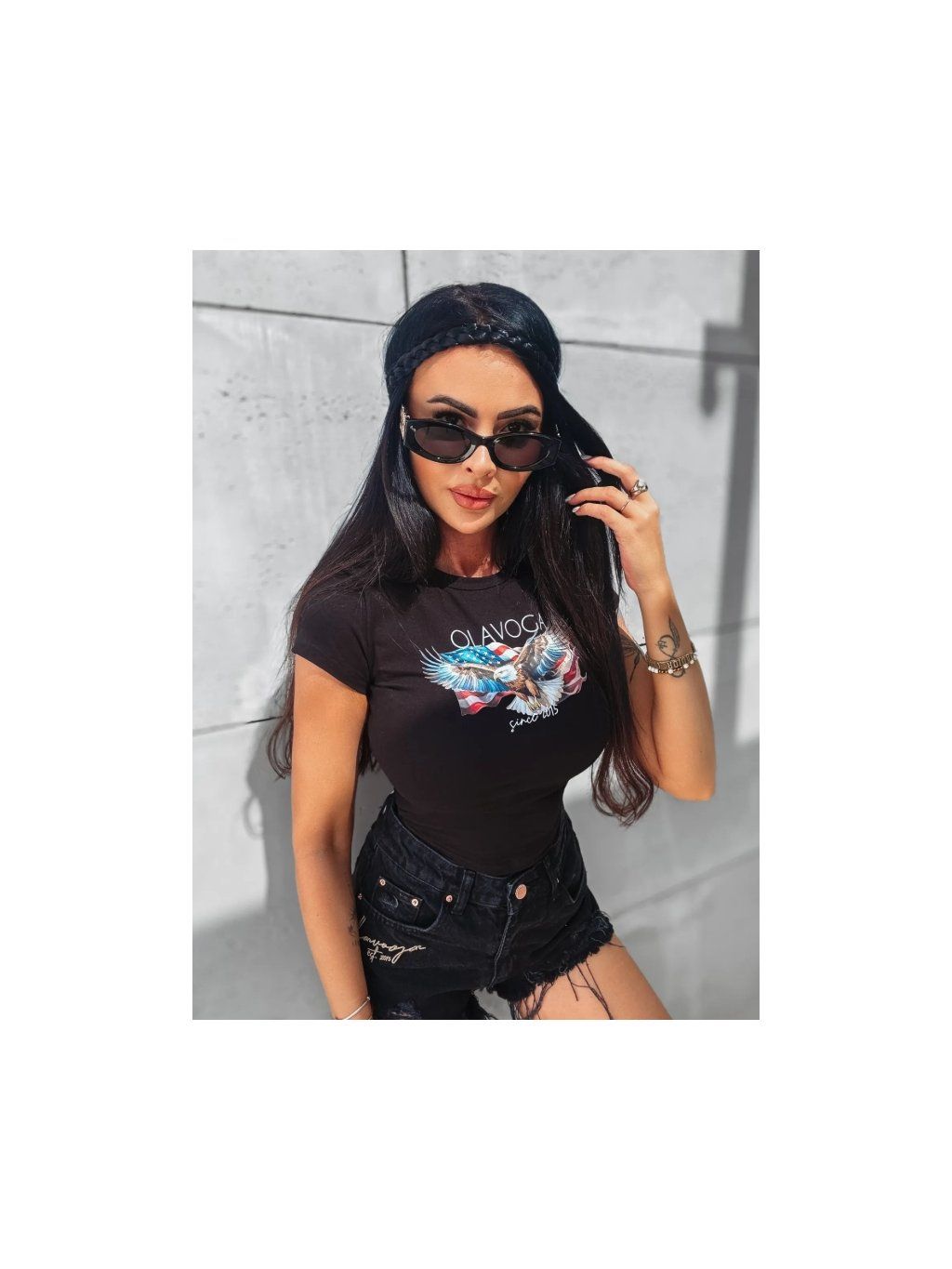 Přiléhající tričko s krátkým rukávem a střihem crop top. Vyrobeno z velmi kvalitní elastické bavlny. Na přední straně je zajímavý potisk orla a logo značky OLAVOGA. Tento módní kousek oblečení dokonale zvýrazňuje siluetu a zároveň nabízí pohodlí díky kvalitním materiálům.