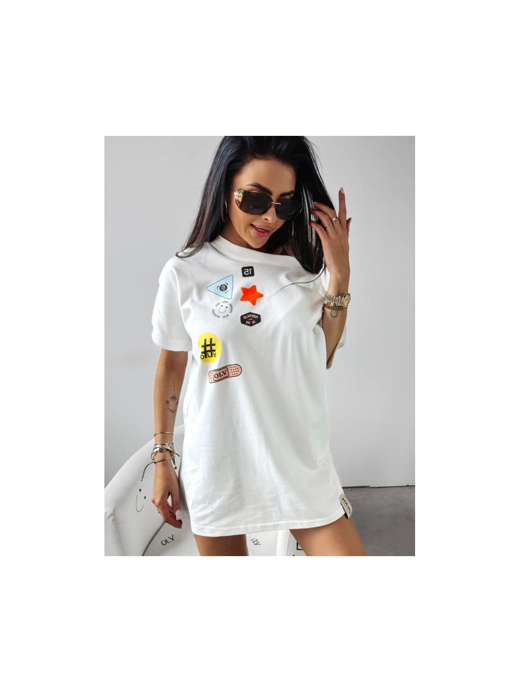 Tričko nadměrné velikosti s krátkým rukávem, vyrobené z elastické bavlny nejvyšší kvality. Velký výstřih a zajímavé vzory na přední straně.