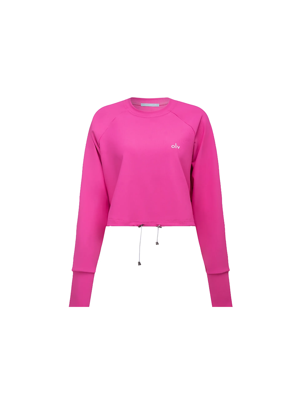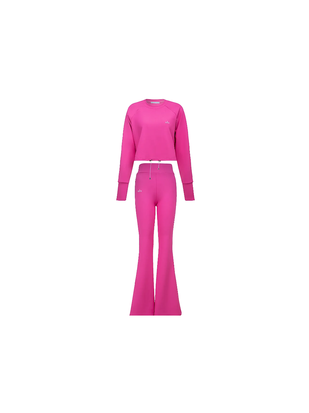 Vrchní díl tvoří krátká halenka klasického střihu s dlouhými rukávy, zakončená jemnými manžetami. Spodní část mikiny je nastavitelná pomocí tenkých šňůrek, což umožňuje přizpůsobení střihu. Na přední straně je minimalistické logo OLV. Spodní část soupravy tvoří kalhoty s vysokým pasem a rozšířenými nohavicemi. Na nohavicích je umístěno decentní logo OLV, které je zachováno v jednotném designu s horním dílem.