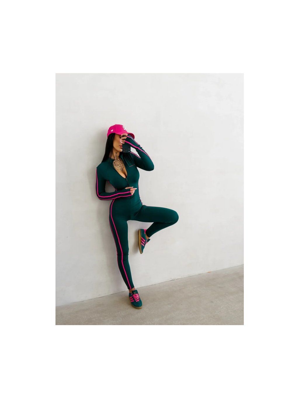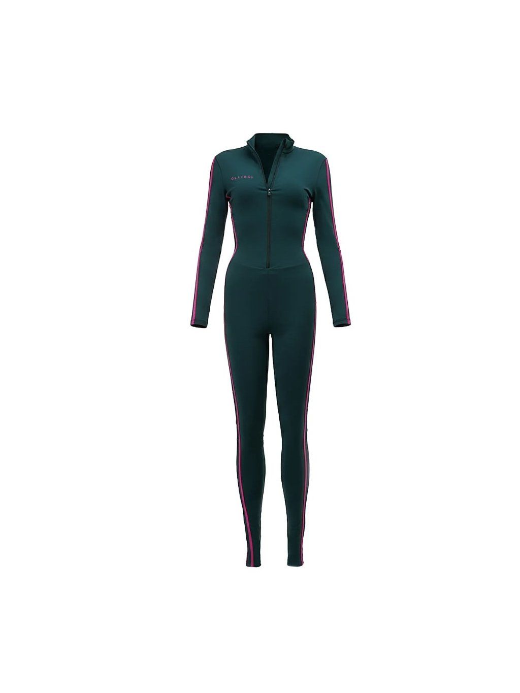 Model s dlouhými rukávy a vysokým límcem se zapínáním na zip. Kontrastní lemování podél rukávů a nohavic dodává sportovní nádech. Na přední straně decentní logo značky OLAVOGA.