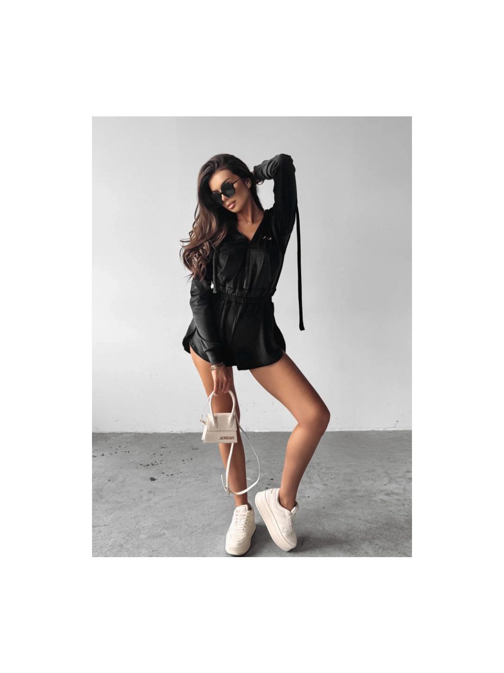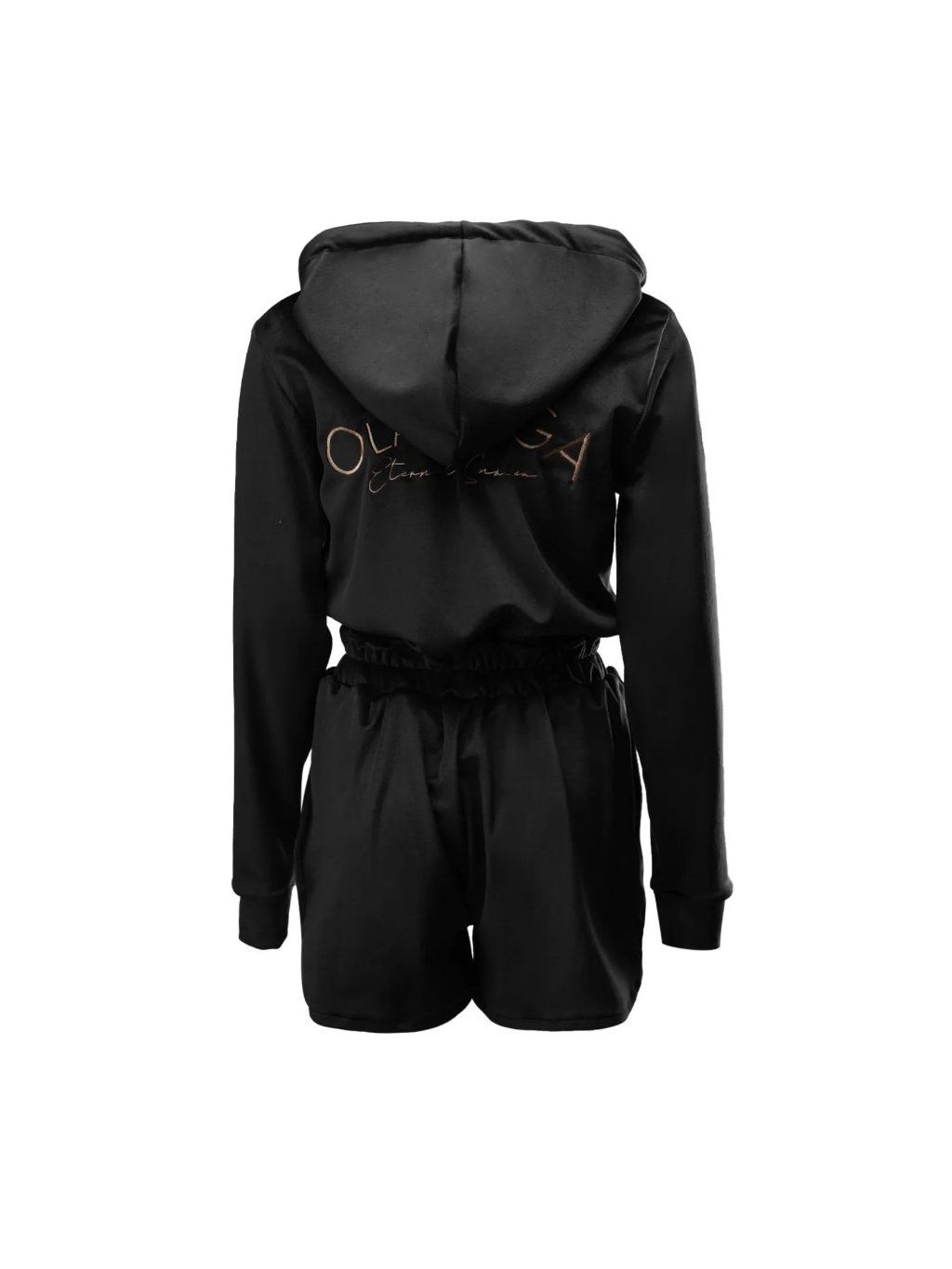 Vrchní část obleku má kapuci a dlouhé rukávy a zapíná se na pohodlný zip. V pase je všitý elastický pásek, který zvýrazňuje siluetu a zajišťuje pohodlné nošení. Spodní část tvoří krátké šortky s mírně rozšířenými nohavicemi, které dodávají lehkost a volnost pohybu.