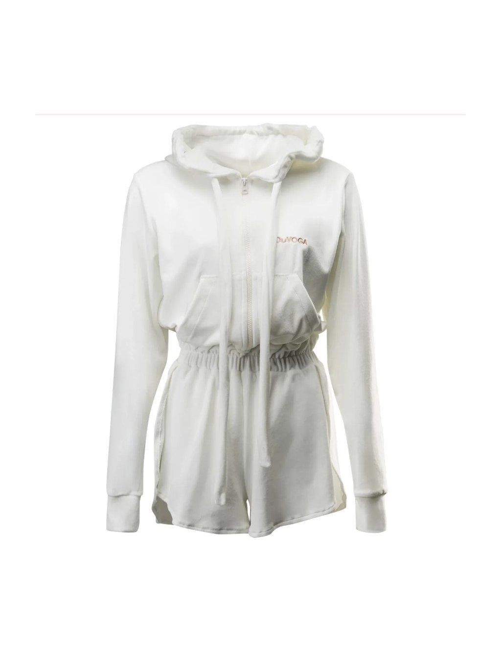 Vrchní část obleku má kapuci a dlouhé rukávy a zapíná se na pohodlný zip. V pase je všitý elastický pásek, který zvýrazňuje siluetu a zajišťuje pohodlné nošení. Spodní část tvoří krátké šortky s mírně rozšířenými nohavicemi, které dodávají lehkost a volnost pohybu.