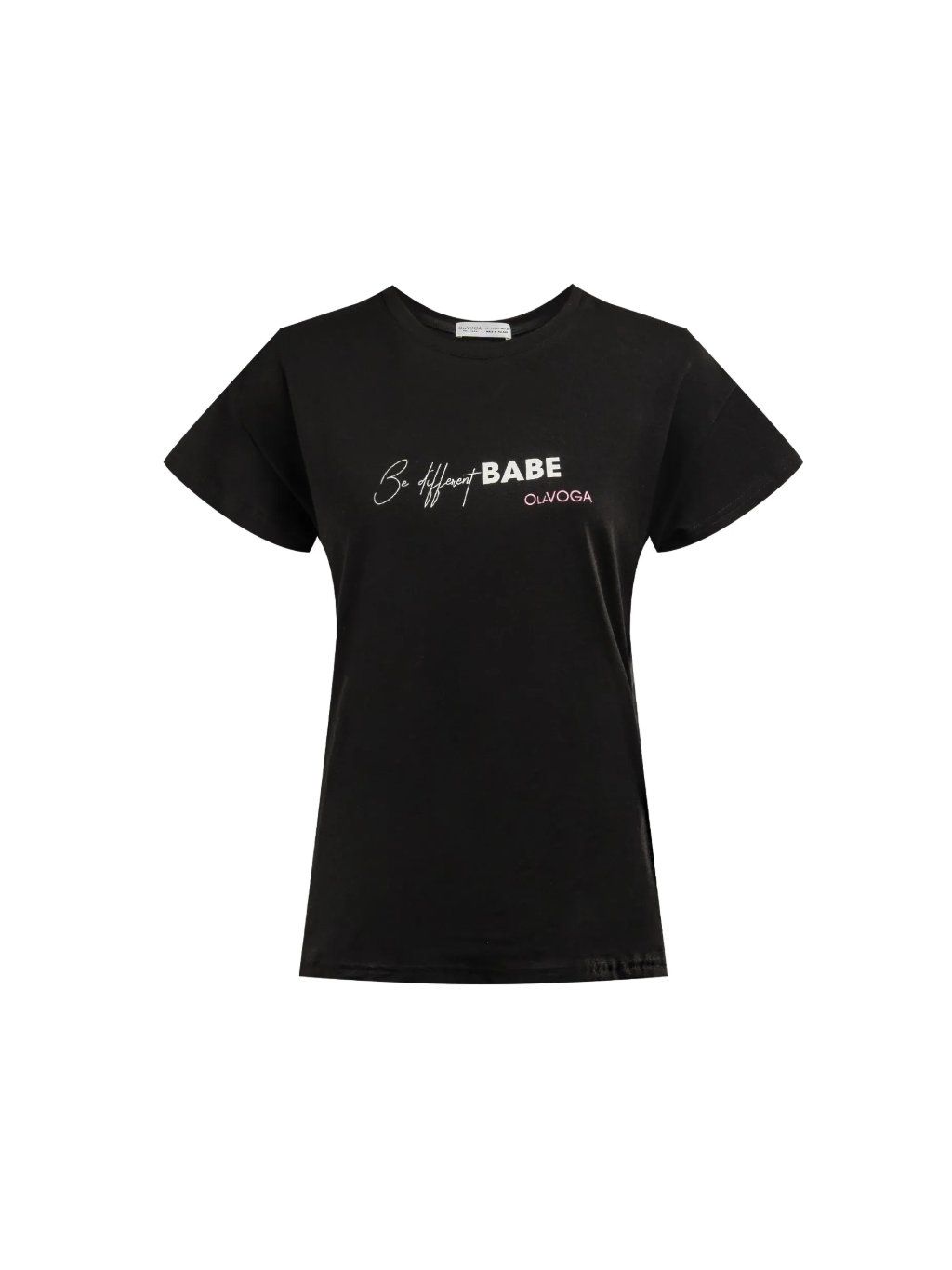 Klasické tričko s krátkým rukávem. Vyrobeno z vysoce kvalitní elastické bavlny. Výrobek má ohrnuté rukávy. Na přední straně nápis BE DIFFERENT BABE s minimalistickým logem značky OLAVOGA.