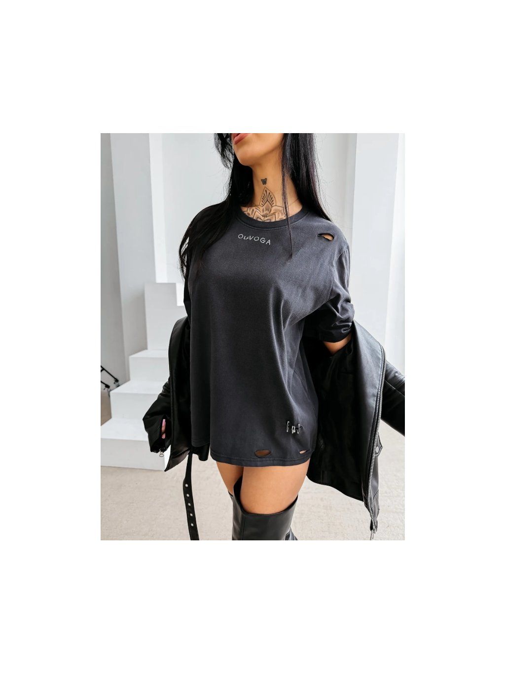 Oversize tričko delšího střihu z měkké, na dotek příjemné bavlny s lehce sepraným efektem. S prodlouženým lemem, krátkými rukávy a klasickým kulatým výstřihem pro pohodlné nošení a ležérní vzhled. Na přední straně je decentní logo OLAVOGA, které podtrhuje minimalistický charakter designu. Celý vzhled doplňuje ozdobné odírání a kovové aplikace na ramenou, které tričku dodávají výrazný módní akcent.