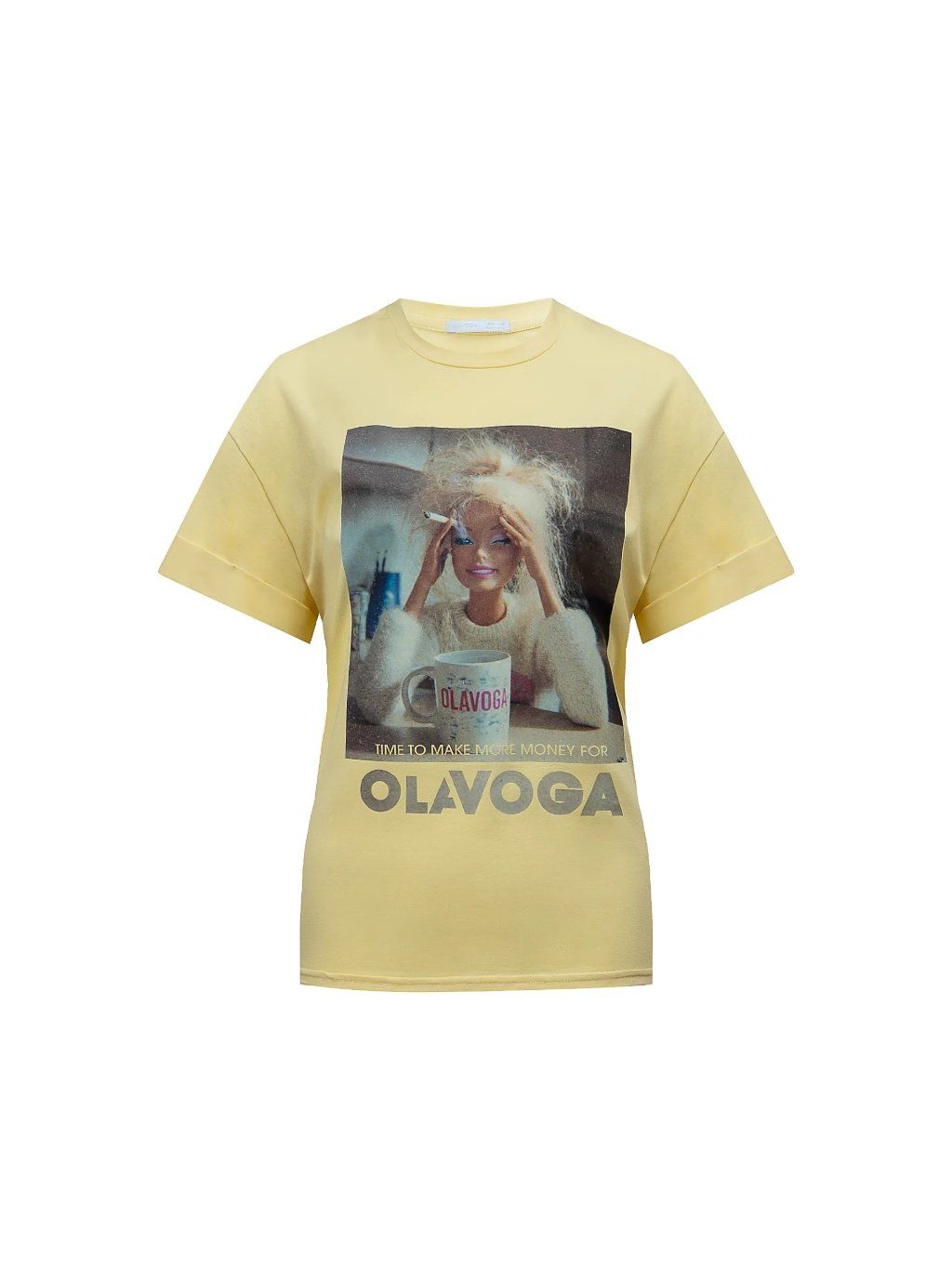 Model má klasický kulatý výstřih a krátké ohrnuté rukávy, což dodává celému vzhledu lehký a ležérní charakter. Výrazná grafika a logo OLAVOGA podtrhují výrazný, módní design trička.
