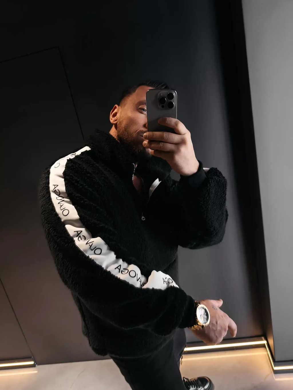 Volně střižený model s mírně zkráceným lemem, u krku se zapíná na krátký zip. Vysoký límec. Na přední straně kapsa zakončená nápisem ESSENCE OF COMFORT s leopardím vzorem. Dlouhé rukávy a spodní lem s elastickými manžetami. Páska s logem OLAVOGA na rukávech. Jemný štítek s logem na boku.