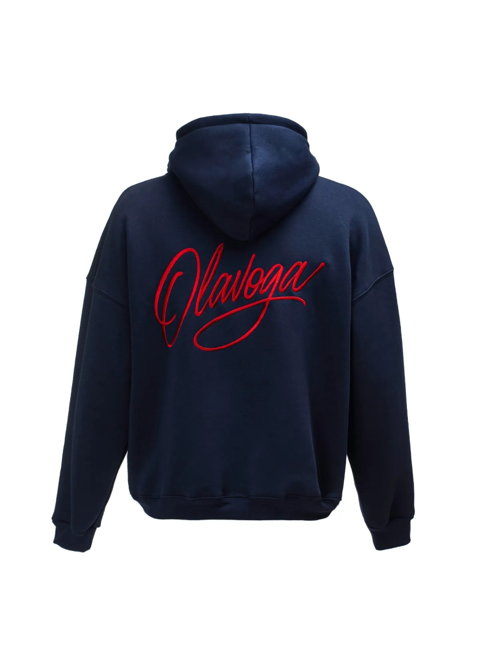 Mikina je vybavena prostornou kapucí a praktickou klokaní kapsou. Přední stranu zdobí decentní vyšívané logo značky OLAVOGA, zatímco zadní stranu zdobí zvětšená, výrazná verze loga pro prémiový dojem.
