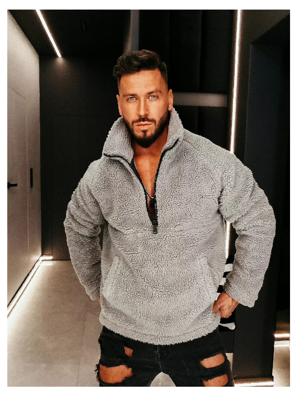 Pánská mikina ležérního, uvolněného střihu, vyrobená z vysoce kvalitní měkké tkaniny teddy pro výjimečný komfort při nošení a příjemné zavinování. Model se zvýšeným límcem a krátkým zipem pod krkem umožňuje upravit výstřih a přizpůsobit styl dané příležitosti. Dlouhé rukávy s volným střihem zdůrazňují volný, moderní charakter střihu. Na přední straně je funkční kapsa, která dodává praktičnost a streetwearový nádech. Výrobek je ručně barvený ruční technikou s výraznou vintage wash úpravou - každá mikina je tedy jedinečná a může se mírně lišit od ostatních kusů. Zip je zakončen kovovým detailem s logem značky OLAVOGA, který podtrhuje rafinované detaily designu.