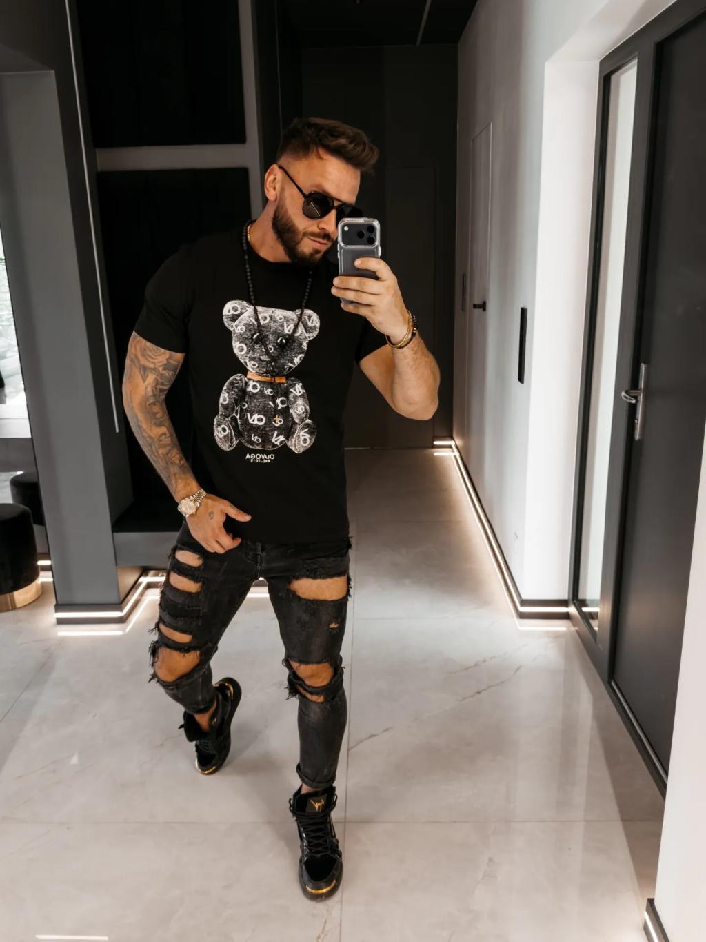 Pánské tričko s výrazným potiskem na přední straně je možností pro ty, kteří mají rádi ležérnost s výraznějším detailem a chtějí rozbít jednoduchý outfit grafickým akcentem. Motiv medvídka, monogram a výšivka budují výraznější vzhled, zatímco ležérní střih se širokými rukávy ponechává volný styl. Černá verze se dobře kombinuje s bílou, šedou a jednoduchými teniskami.
