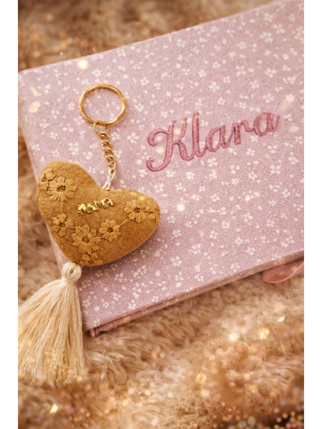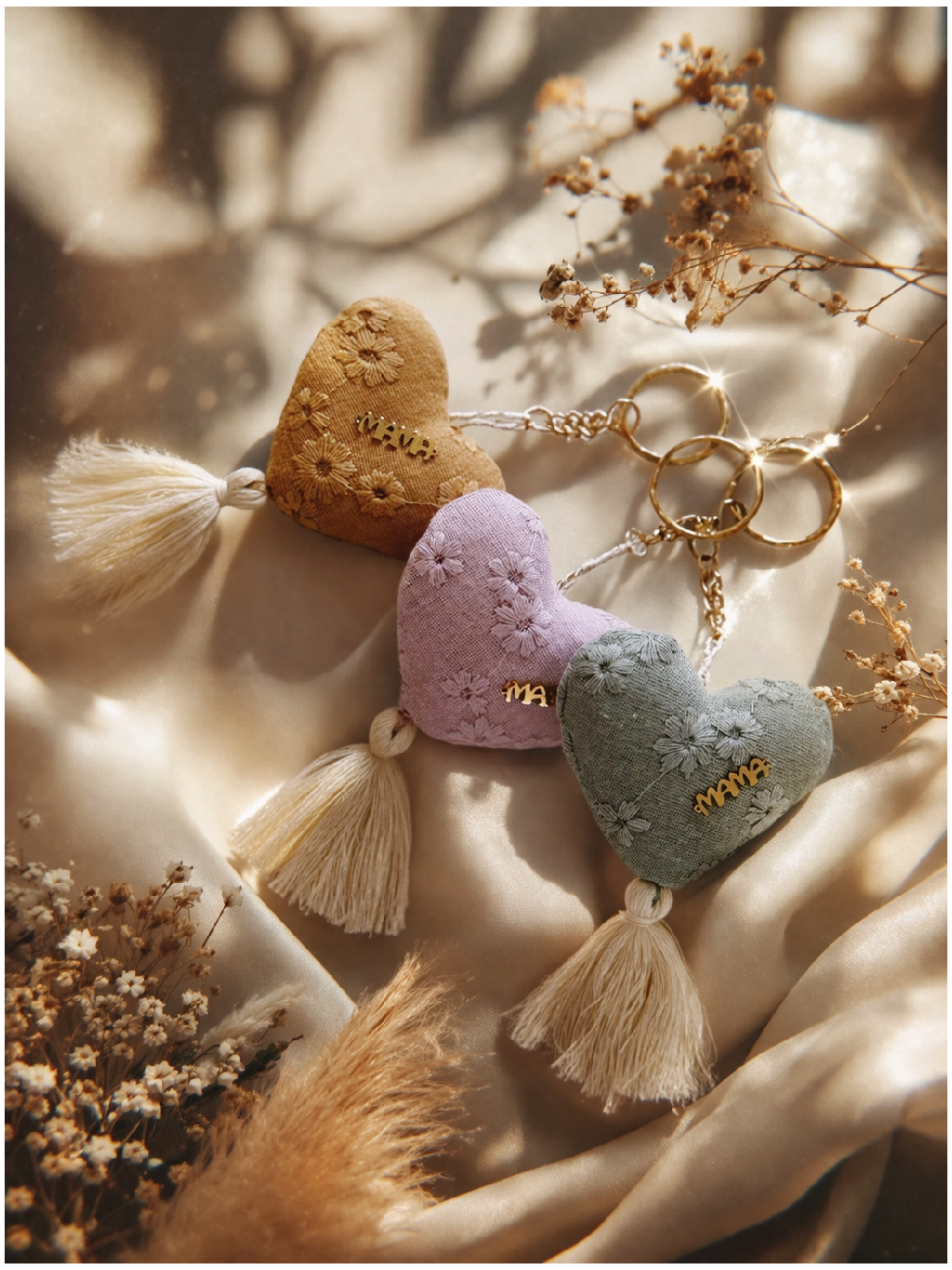 Bavlněná klíčenka ve tvaru srdce vyrobená z dekorační látky s decentní výšivkou. Klíčenka je prodloužena jemným střapcem krémové barvy. Nápis "MAMA" je zlatý.