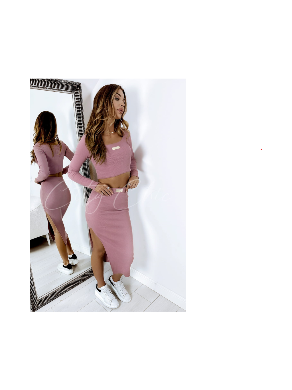 Objevte tuto žebrovanou soupravu, která zvýrazní vaši postavu a dodá eleganci každému outfitu. Zkrácená halenka s dlouhým rukávem a zlatou nášivkou uprostřed dodává decentní, ale zároveň výrazný akcent. Midi sukně s rozparkem na nohavici nejenže zdůrazní vaše nohy, ale také dokonale obepne vaši postavu a vytvoří tak ženský a stylový outfit.