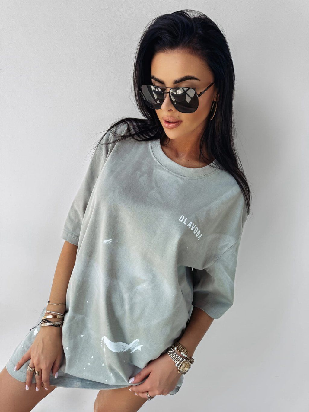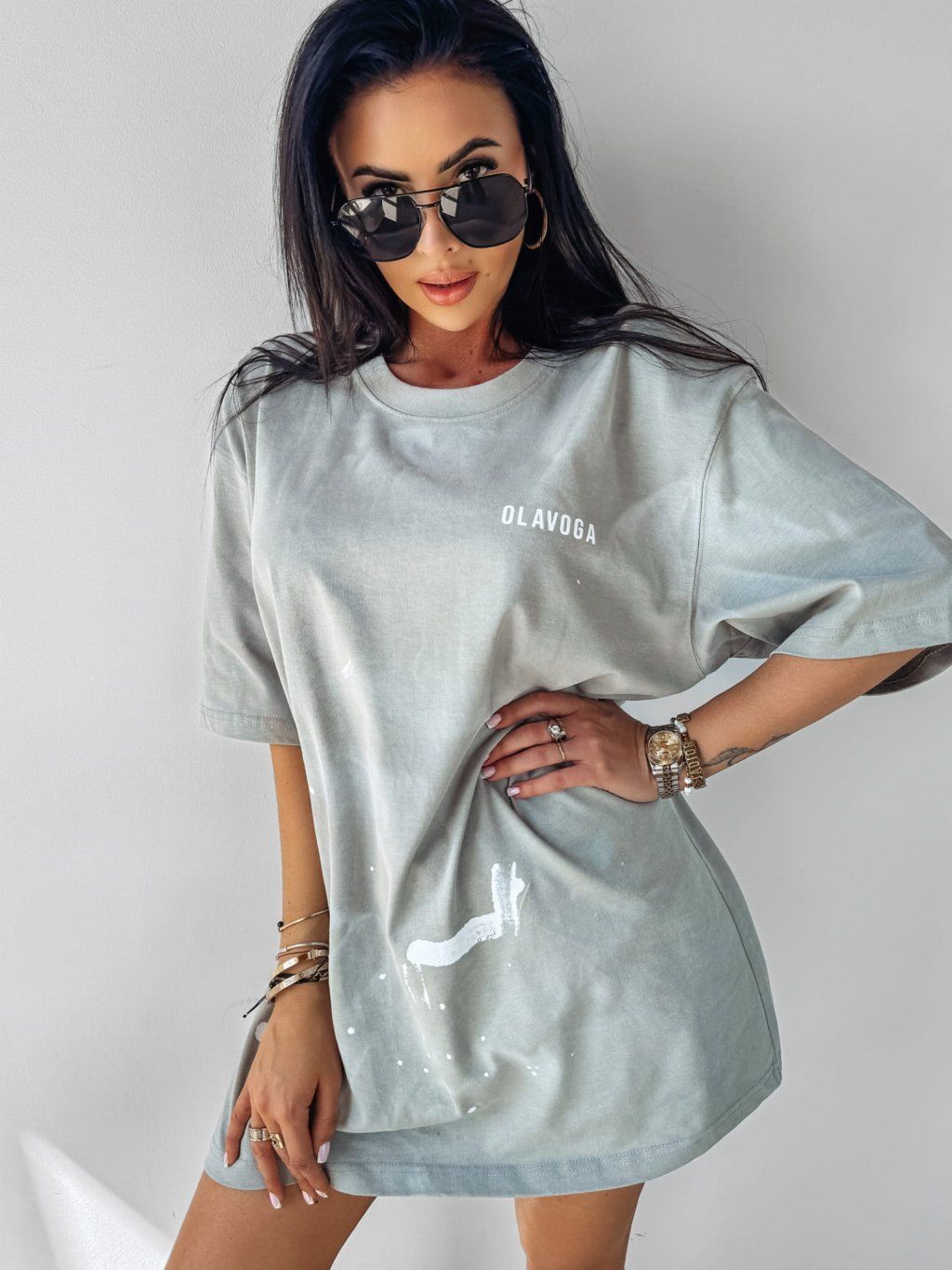 Krátké, oversized tričkové šaty s krátkým rukávem. Vyrobené z vysoce kvalitního, pružného materiálu, zdobí je zajímavý, potisk s mašlemi po celé délce. Na přední straně je minimalistické logo značky. Na zadní straně je vyšitý velký nápis „JUST KEEP GOING“. Na jednom rukávu je zlaté logo OLAVOGA.