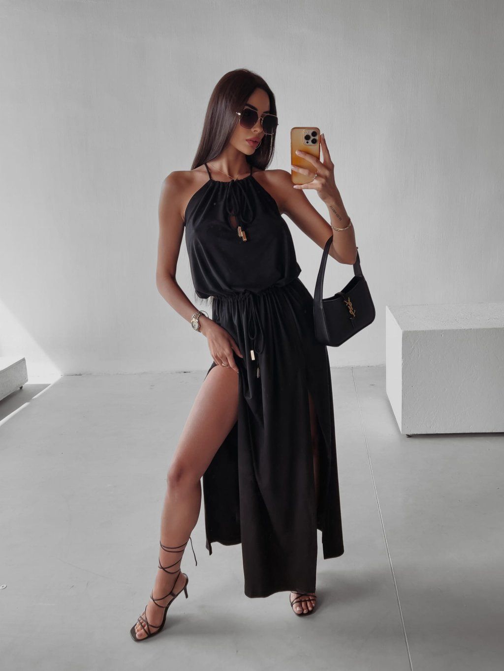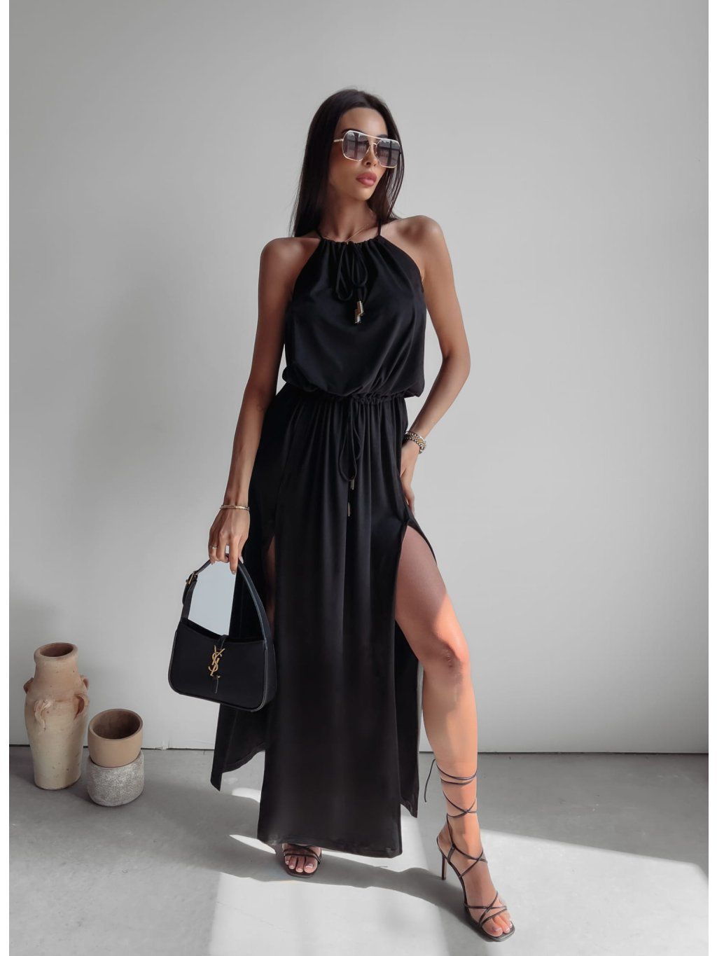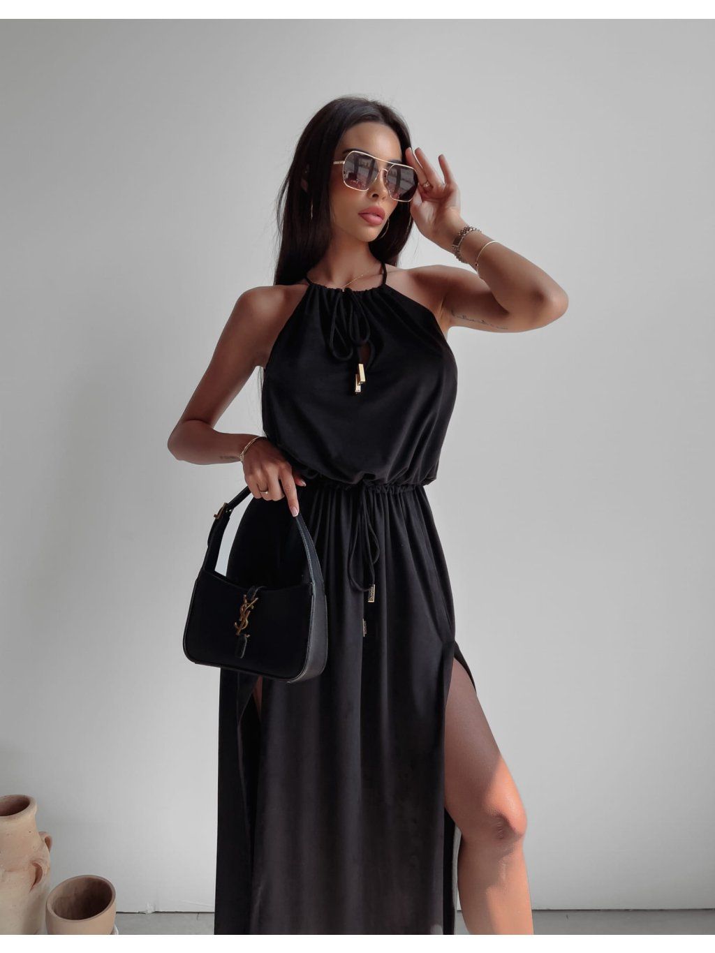 Maxi šaty s hlubokými rozparky, vyrobené z nejkvalitnější semišové látky. Rozparky zeštíhlují postavu a maximálně prodlužují nohy. Dvojité zavazování u krku a v pase umožňuje přiléhavý střih.