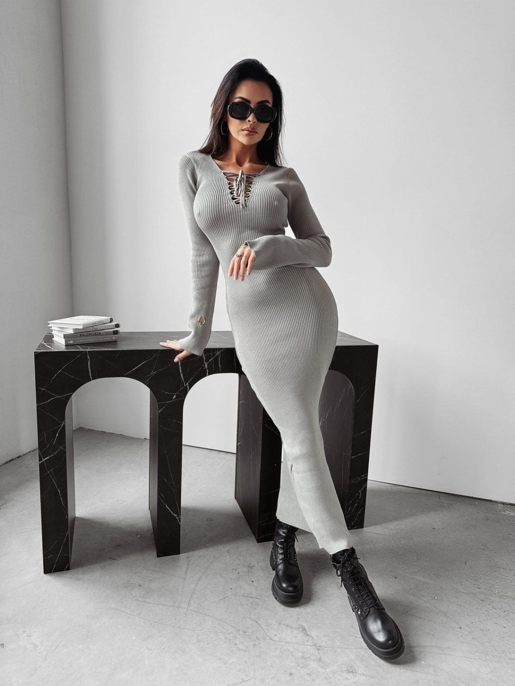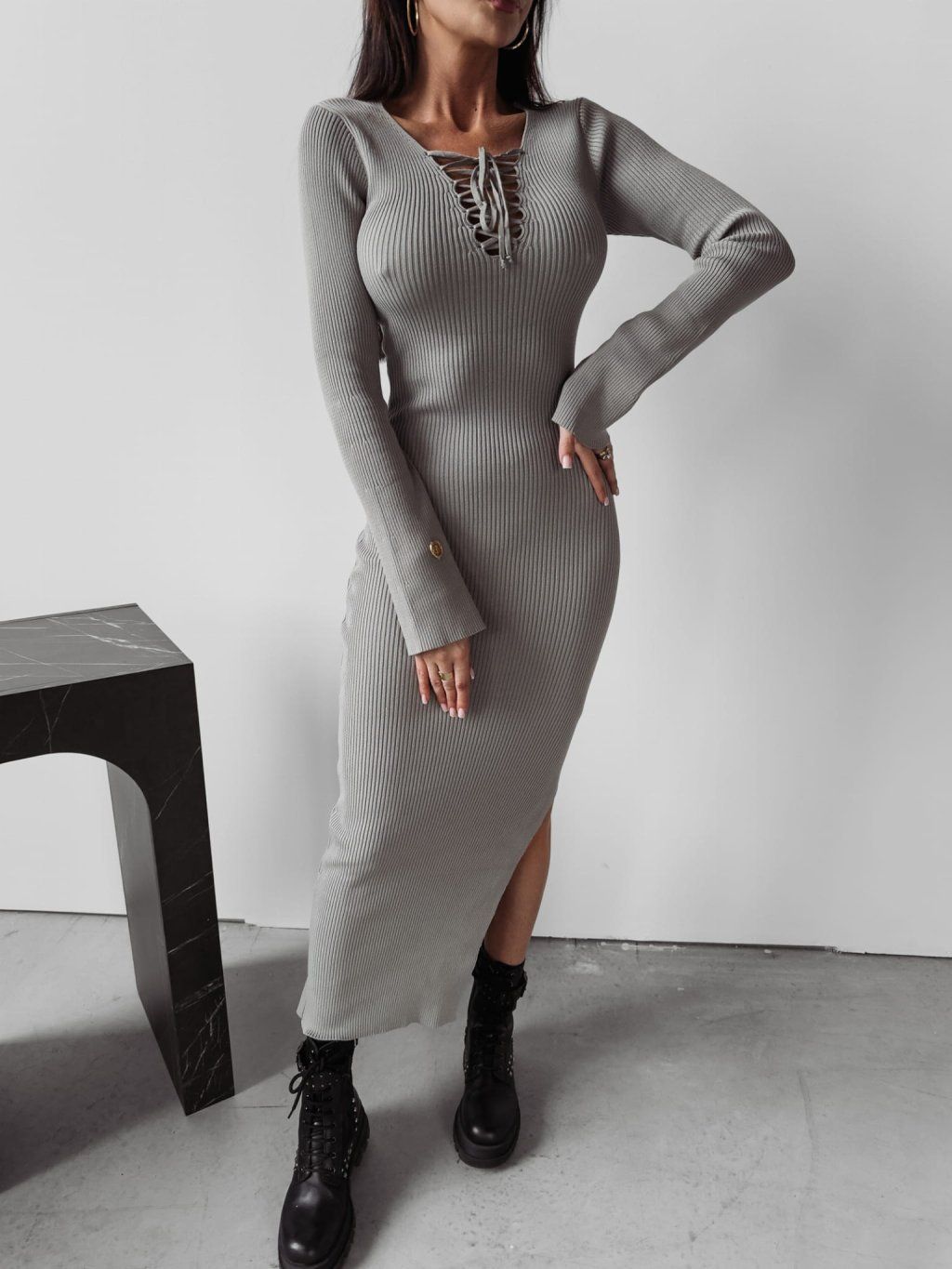 Přiléhavé maxi šaty s vázáním vpředu. Hladká žebrovaná látka, dlouhé rukávy a zlatý odznak zdobený logem značky.
