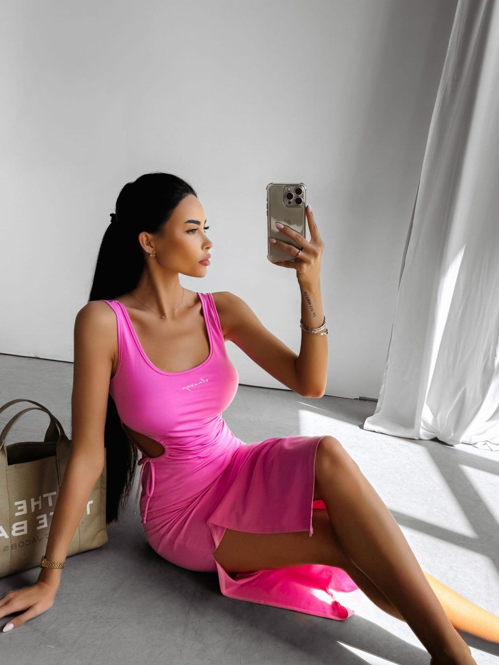 Přiléhavé midi šaty bez rukávů s délkou ke kolenům. Jsou vyrobeny z vysoce kvalitní látky a mají boční rozparky s nastavitelnými šňůrkami. Na přední straně je vyraženo logo OLAVOGA a vzadu je rozparek.