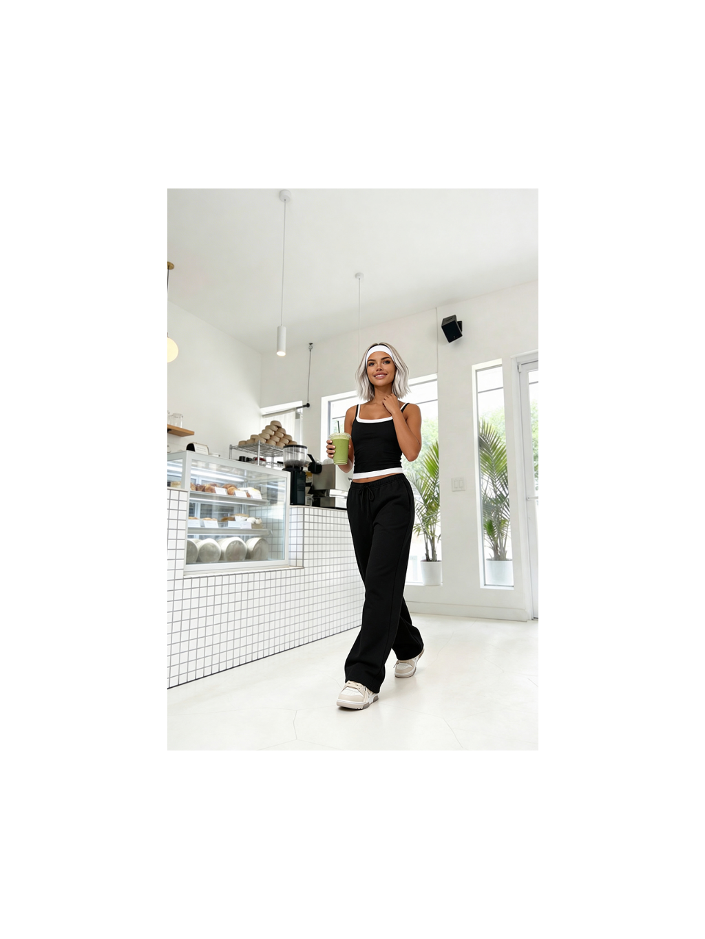 Volné tepláky + neobvyklá kombinace dvou topů – jednoho delšího, jednoho kratšího – vytvářejí ucelený vzhled!