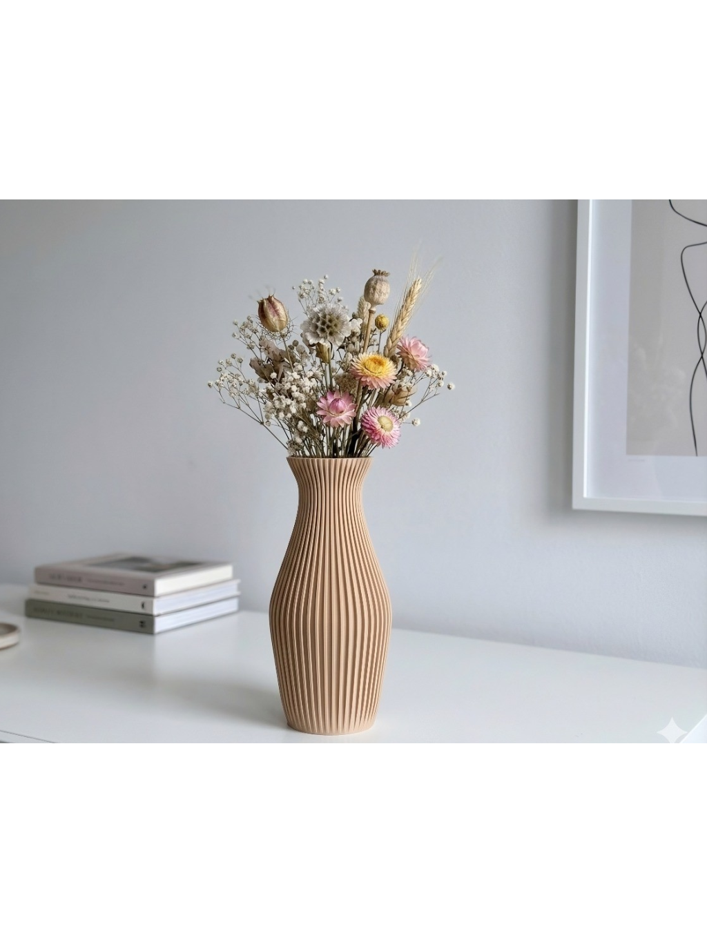 Tato stylová váza, vytvořená pomocí technologie 3D tisku z rostlinného PLA materiálu, je ideálním místem pro vaše oblíbené sušené květiny a pampovou trávu.Je skvělým originálním a personalizovaným dárkem pro milovanou osobu nebo moderním doplňkem vaší kanceláře či obývacího pokoje.