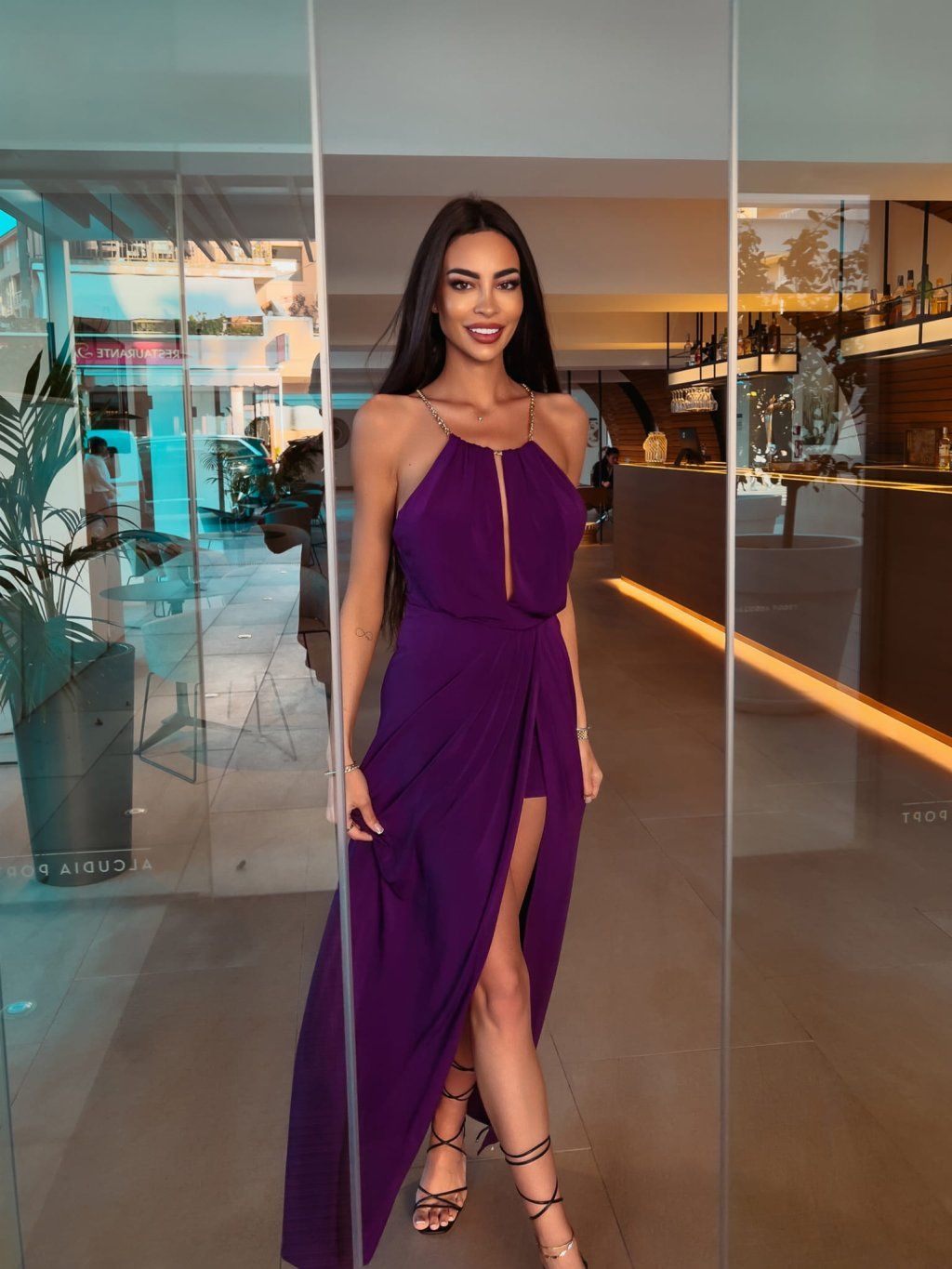 Elegantní maxi šaty zdobené zlatým řetízkem u krku. Pečlivě vyrobené, s rozparkem vpředu i vzadu a hlubokým rozparkem, který svůdně odhaluje nohy. Ideální jak pro formální událost, tak pro letní zahradní párty.