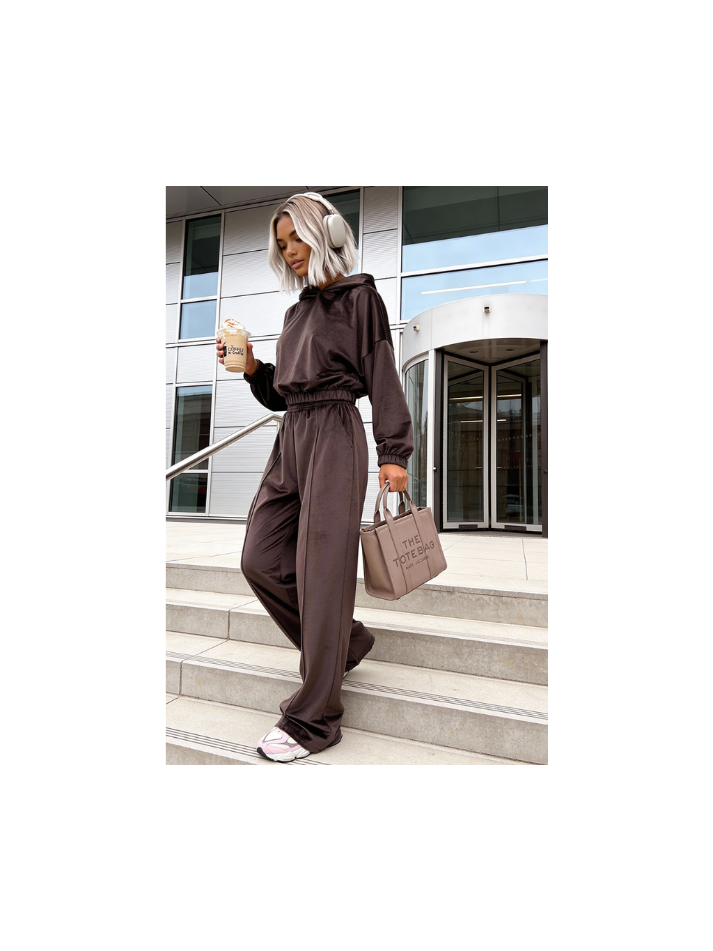 Souprava, která kombinuje pohodlí s módním, ležérním stylem. Zkrácená mikina a dlouhé, široké kalhoty vytvářejí harmonický celek, zatímco kapuce a praktická kapsa dodávají pohodlí a ležérní nádech.