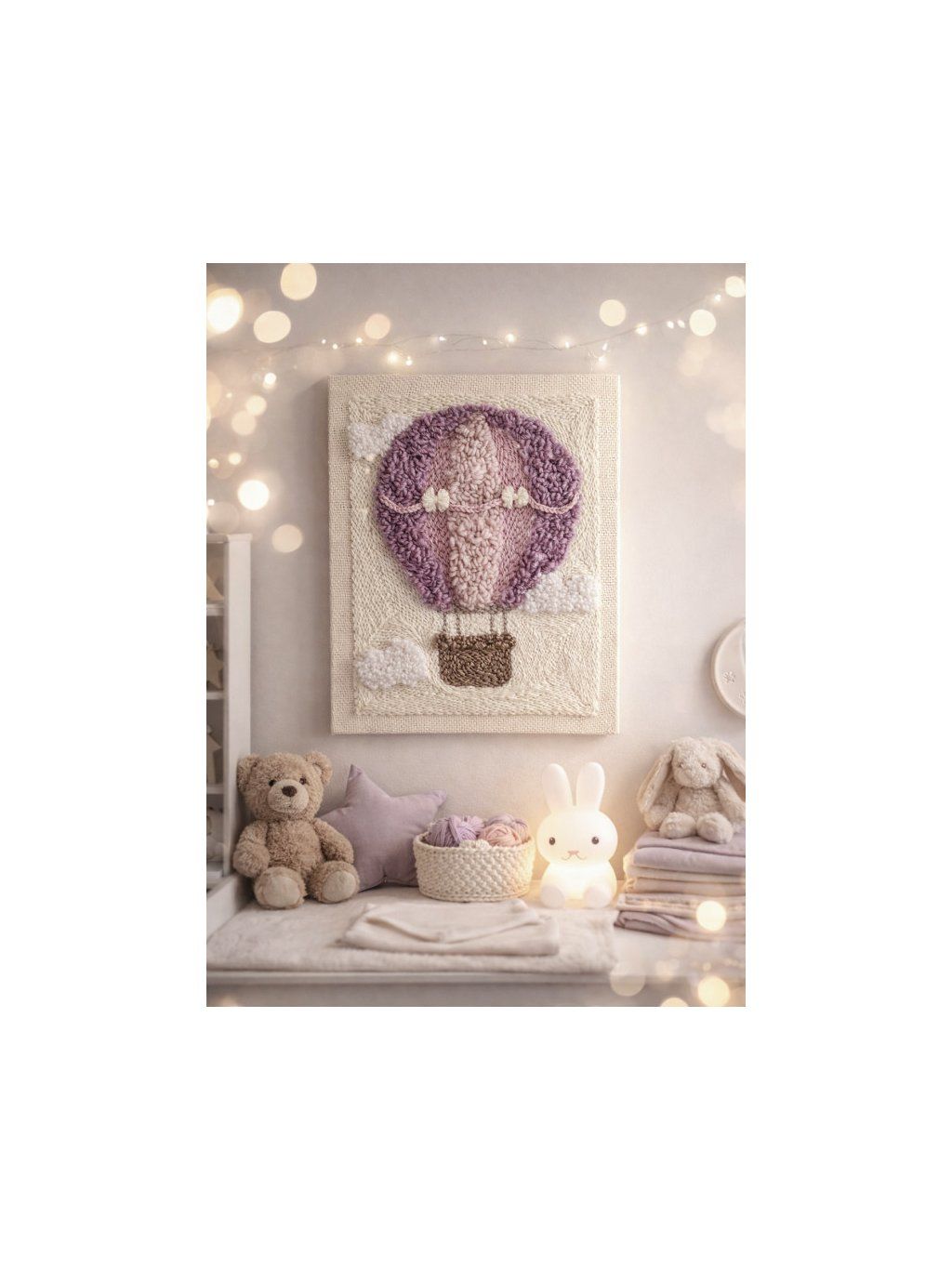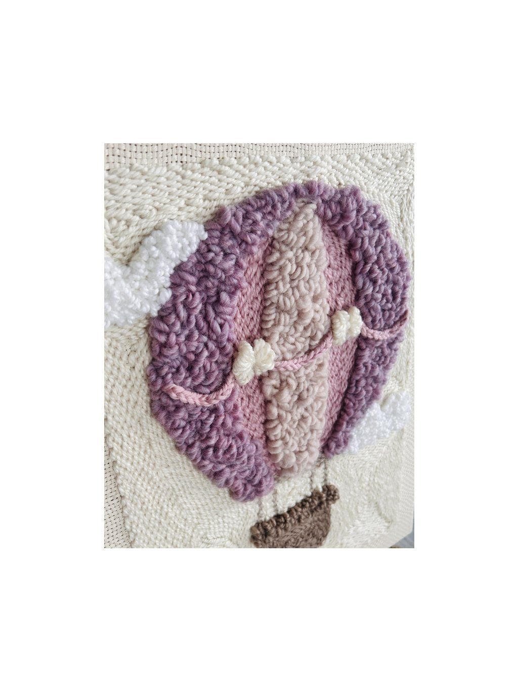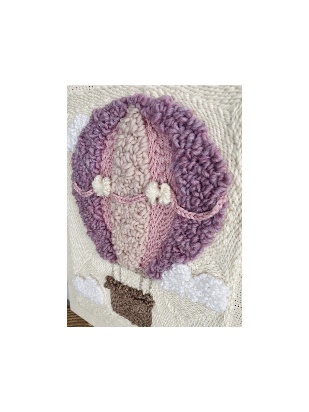 Tkaný obraz "Balónek snů" 40x50 cm – Dekorace nebo personalizovaná jmenovka. Tento ručně vyrobený tkaný obraz s motivem dekorativního balónku je jedinečným doplňkem dětského pokoje. Je vyzdoben v teplých, jemných barvách ecru, pudrově růžové, tlumené fialové a přírodní hnědé a do místnosti vnáší útulnost a jemnou pohádkovou atmosféru. Díky použití různých tkalcovských technik má obraz krásnou, trojrozměrnou texturu, která mu dodává jedinečný charakter. Tato dekorace je vytvořena s důrazem na každý detail – jemná, přírodní a nadčasová. Rozměr: 40x50 cm Styl: boho / přírodní / dětský Barvy: ecru, odstíny růžové a fialové, hnědý košík Dvě možnosti: Dekorativní verze. Obraz tvoří okouzlující, samostatnou dekoraci do dětského pokoje – ideální nad postýlku, komodu nebo do herního koutku. Je skvělým dárkem na oslavu narození dítěte, k narození dítěte nebo jako stylový doplněk do interiéru dítěte. Personalizovaná verze – rodný list. Obraz si můžete objednat s dalšími, gravírovanými dřevěnými přívěsky s informacemi o narození dítěte (jméno, datum, čas, váha, výška). Přírodní dřevěné prvky harmonicky doplňují barvy obrazu a dodávají mu jedinečný, pamětní charakter. Tato dekorace se stane krásným rodným listem – osobní památkou na celý život.