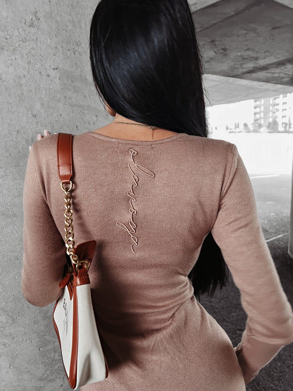 Přiléhavé svetrové šaty z měkké a pohodlné látky. Mají velký kulatý výstřih a dlouhé rukávy s průstřihem na prsty. Na zádech je 3D výšivka s písemným logem značky. Střih tužky zdůrazňuje postavu.