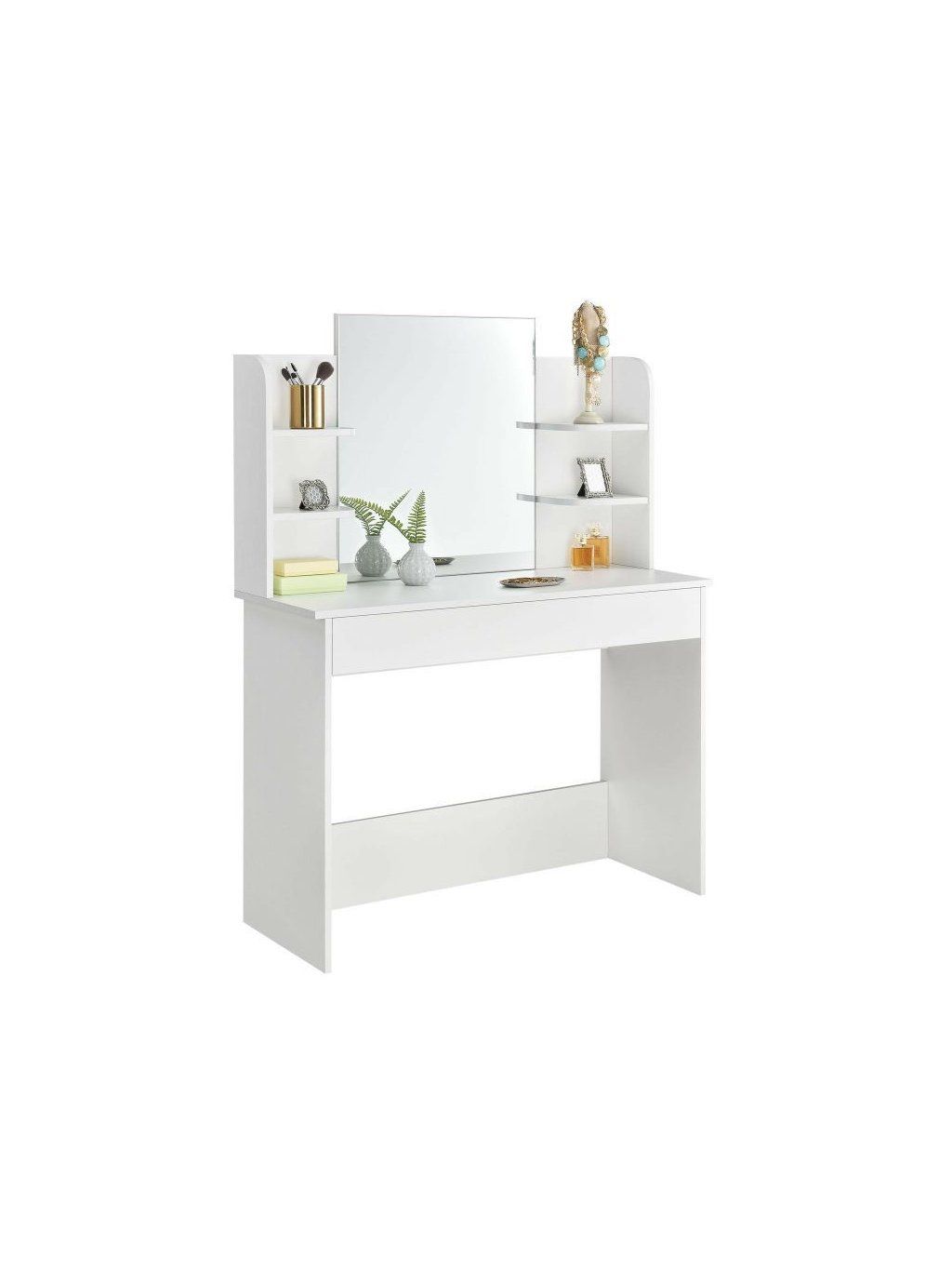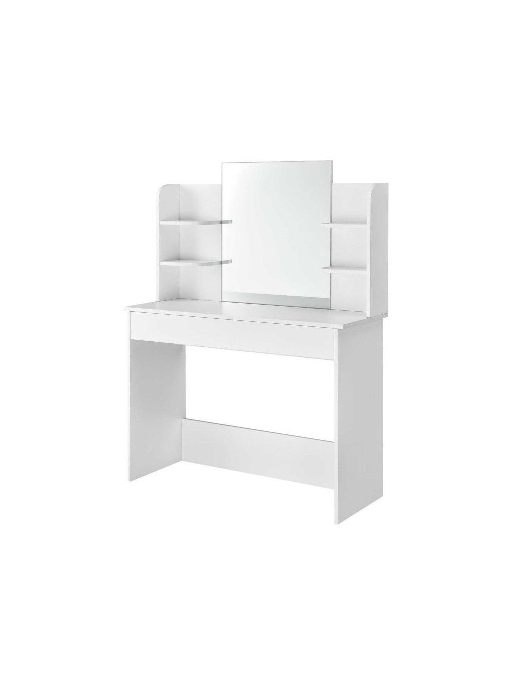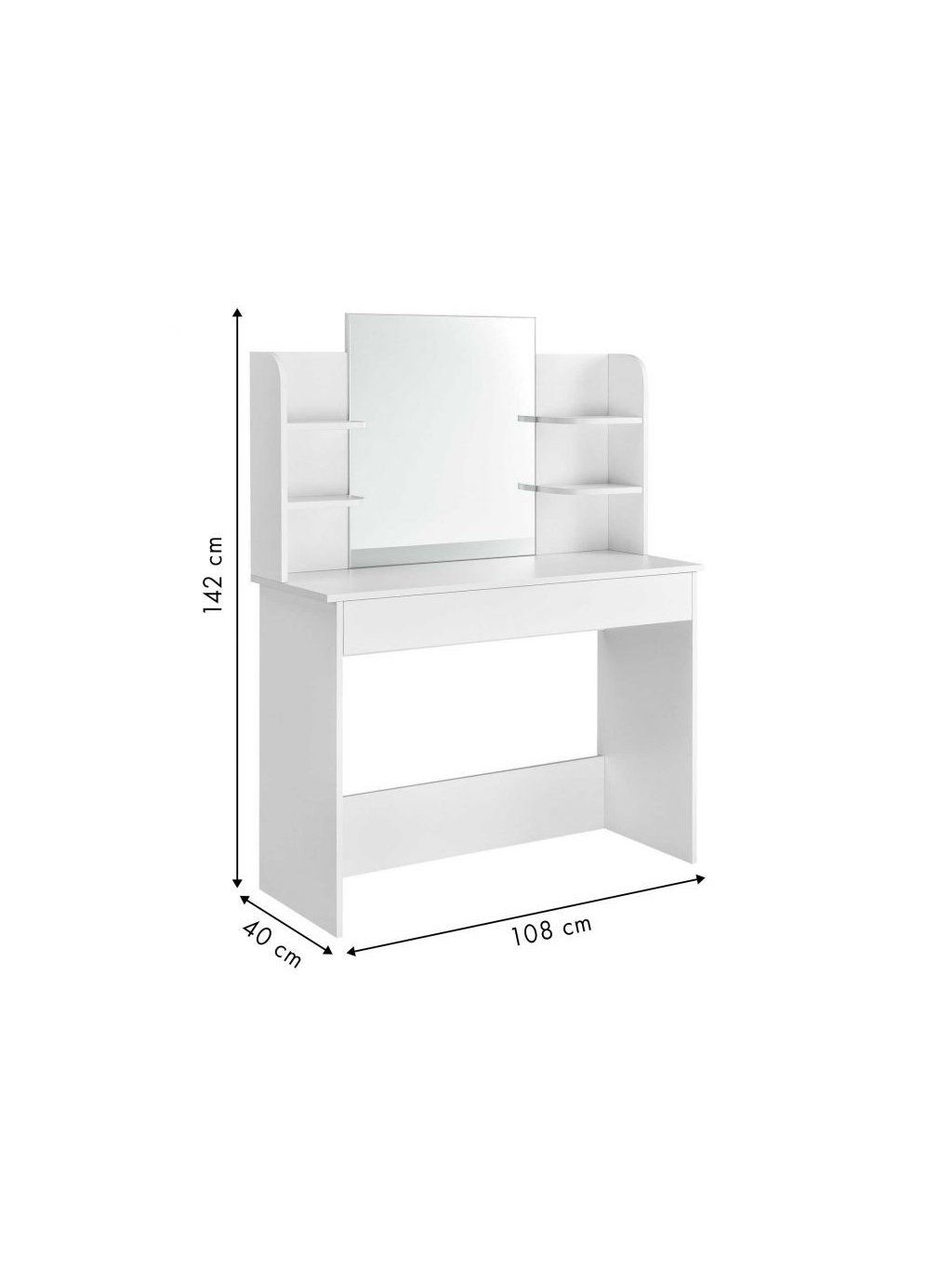 Dominantou stolku je velké zrcadlo, které poskytuje ideální podmínky pro líčení, péči o pleť i úpravu vlasů. Boční police umožňují přehledné uspořádání kosmetiky, parfémů a doplňků, zatímco široká zásuvka s přihrádkami zajistí, že všechny drobnosti budou vždy po ruce a pracovní plocha zůstane uklizená.