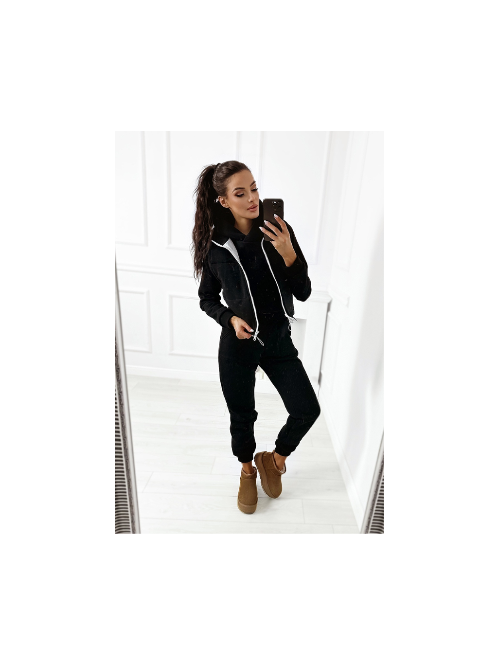 Sada obsahuje: dlouhé kalhoty s vysokým pasem, pohodlnou mikinu s kapucí a unikátní vestu. Mikina je ve spodní části zakončena elastickou, nesvazující gumou a kalhoty dokonale zdůrazňují postavu.