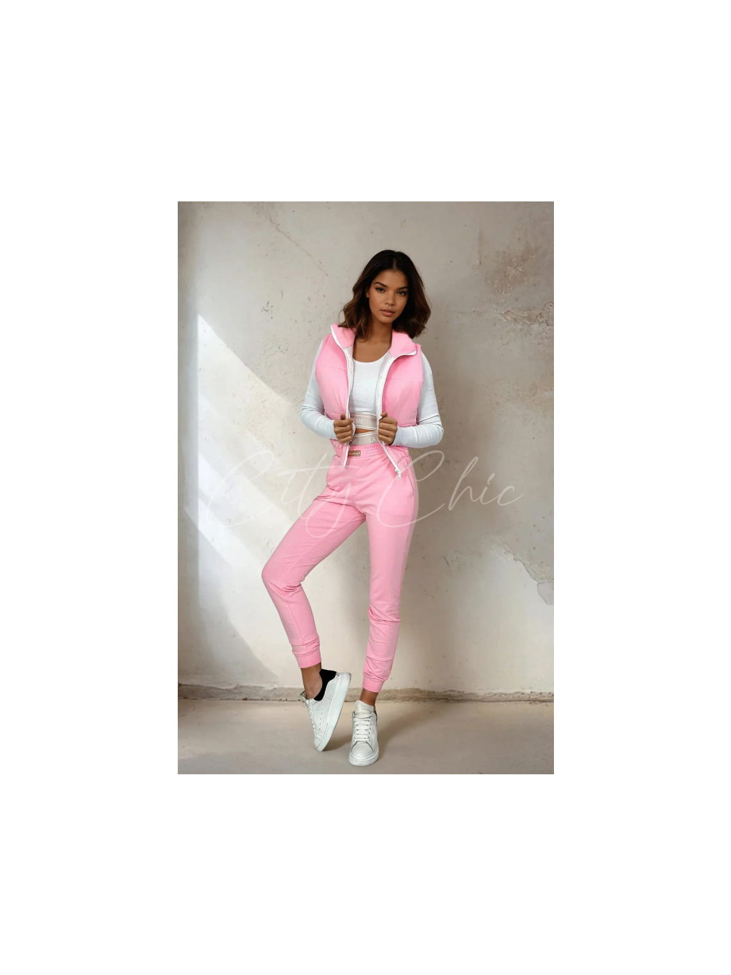 Objevte stylovou třídílnou soupravu, která zaujme svým moderním designem! Prošívaná vesta dodává vzhledu charakter, zatímco dlouhý žebrovaný top s gumičkou v barvě latte s logem dokonale zdůrazňuje siluetu. Soupravu doplňují pohodlné tepláky se stejnou gumičkou pro každodenní pohodlí.