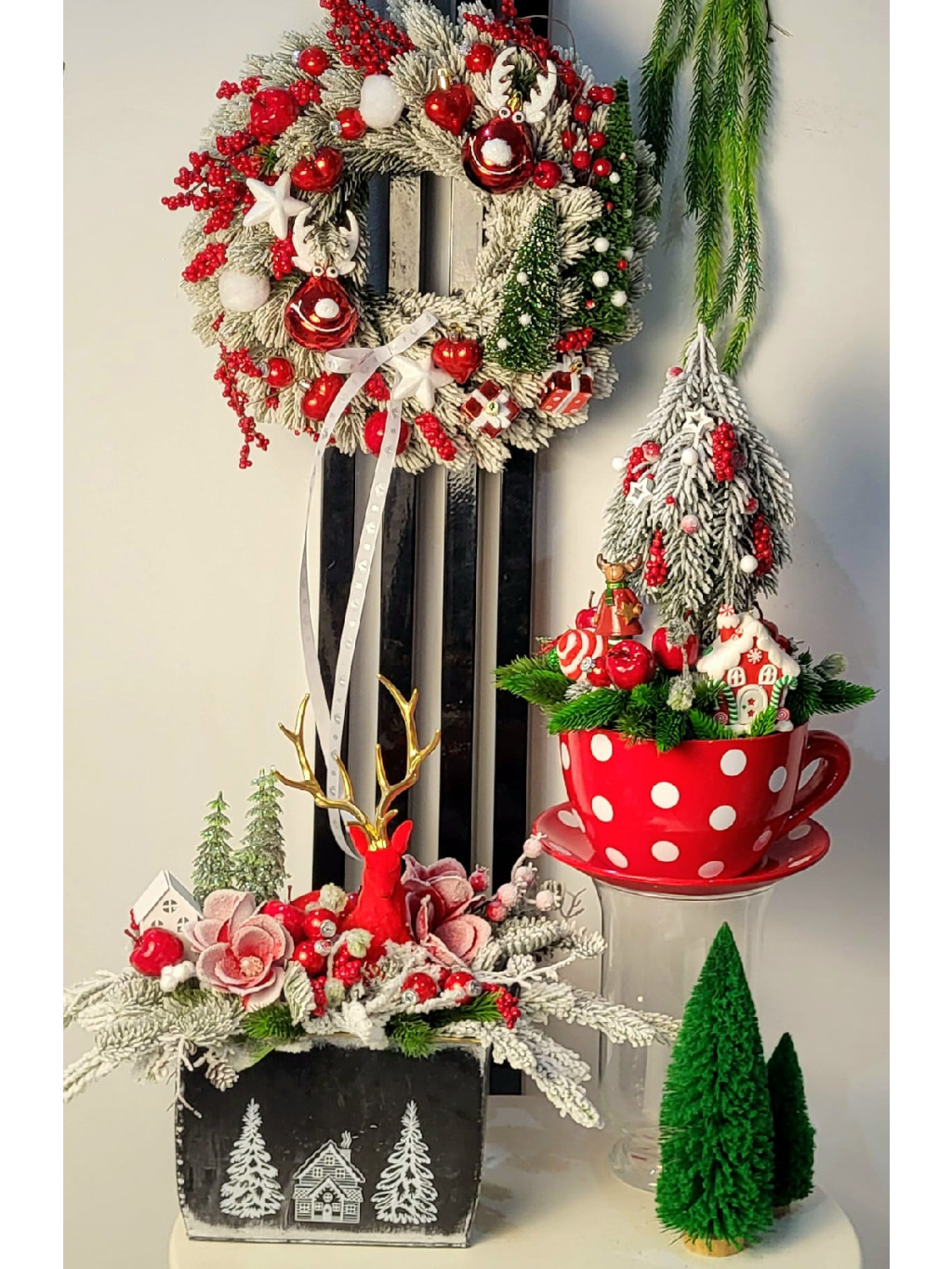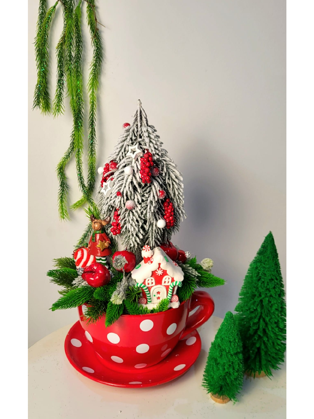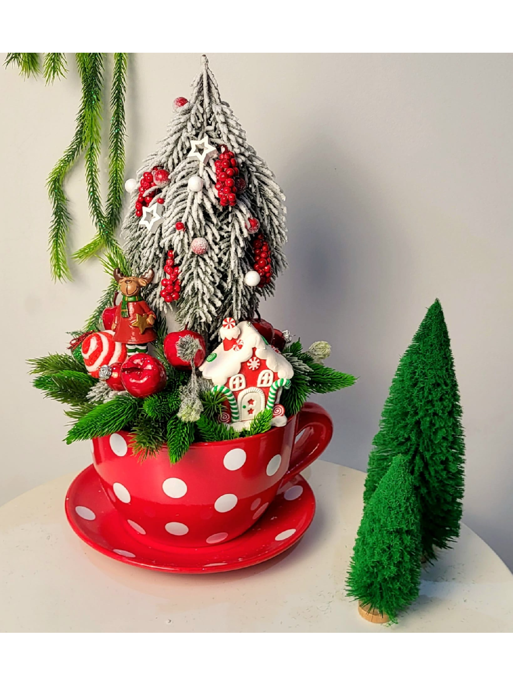 - Výrazná vánoční dekorace se zasněženým vánočním stromečkem v okouzlujícím, velkém kelímku.