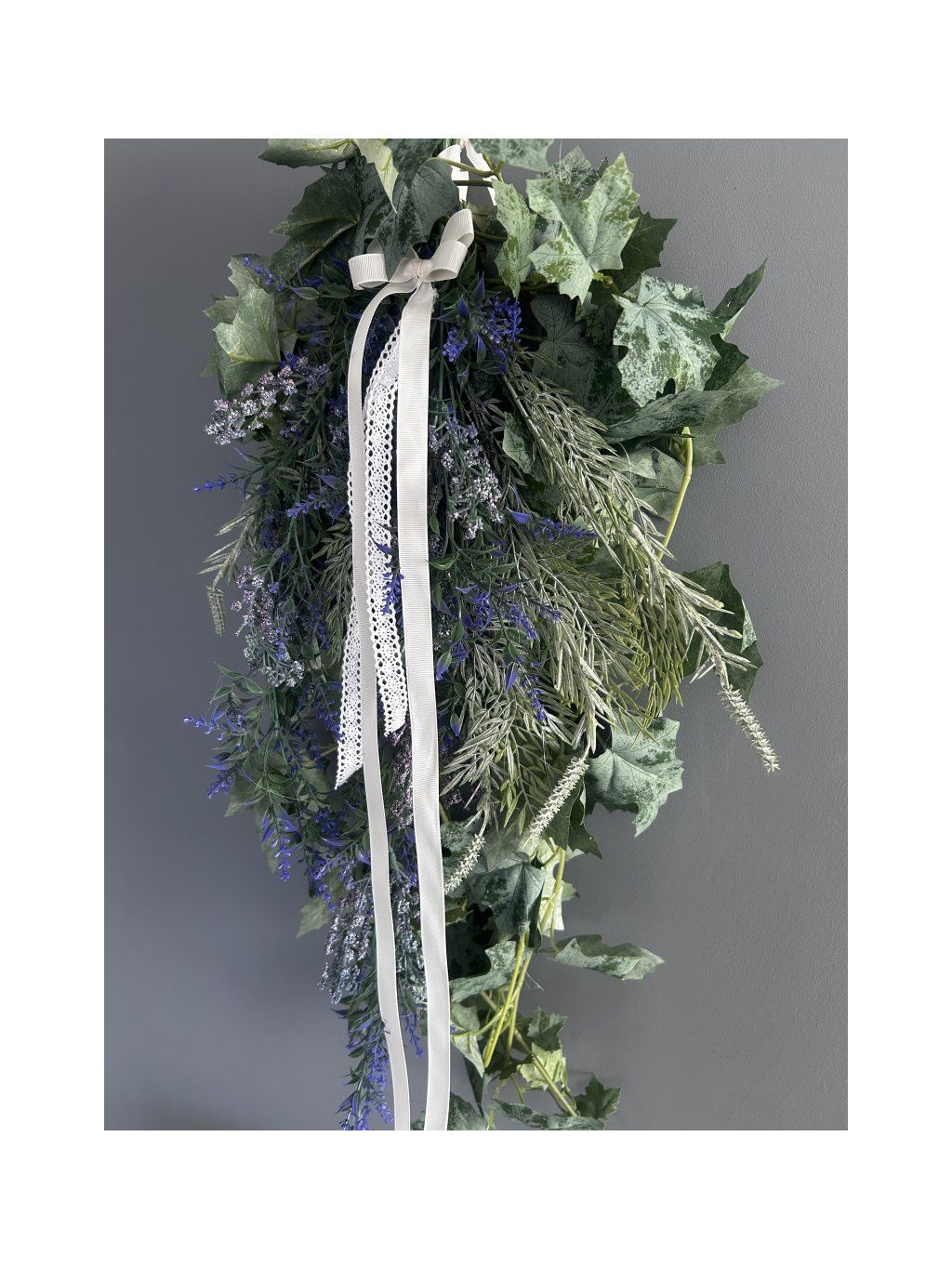 Dekorace na dveře v přírodním, zahradním stylu, vytvořená pro ty, kteří oceňují decentní eleganci a lehkost tvarů. Nejedná se o klasický věnec – jde o volně padající aranžmá, které přitahuje pozornost svým tvarem a jemným pohybem. Základ tvoří bujná zeleň inspirovaná listy břečťanu, rozbitá decentními akcenty v odstínech modré a fialové, které dodávají dekoraci romantický nádech. Pečlivě vybraná stuha doplňuje design – kombinace hladké stuhy a decentní krajky, která dekoraci dodává lehkost a výjimečnou eleganci. Díky svému protáhlému tvaru (cca 80 cm) dekorace vypadá krásně na dveřích a vytváří výraznou a zároveň harmonickou vstupní dekoraci. Je ideální pro jarní a letní období a slouží také jako celoroční doplňky pro milovníky přírodních aranžmá.