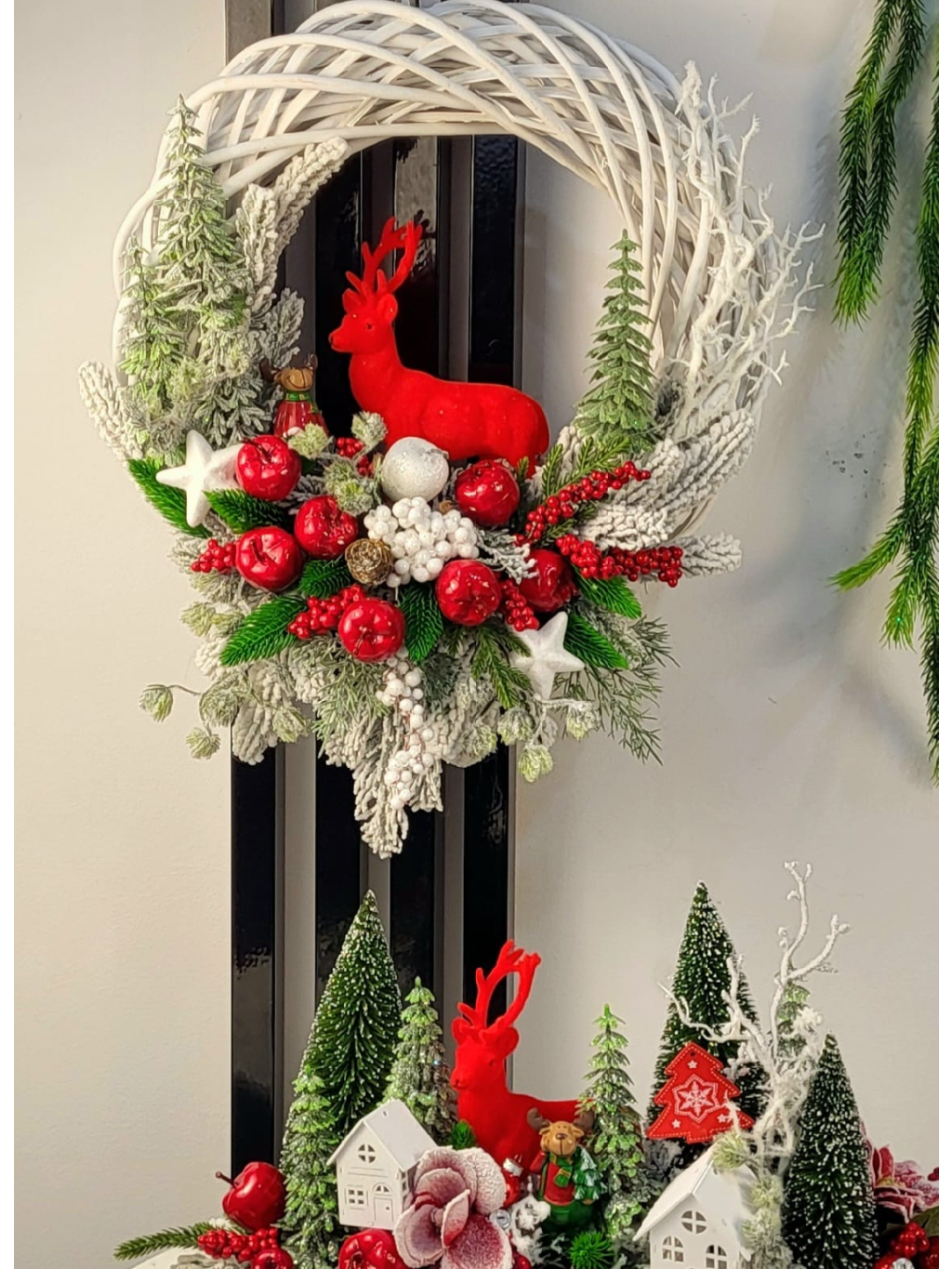 - Okouzlující červené doplňky dodávají věnci jedinečný vzhled