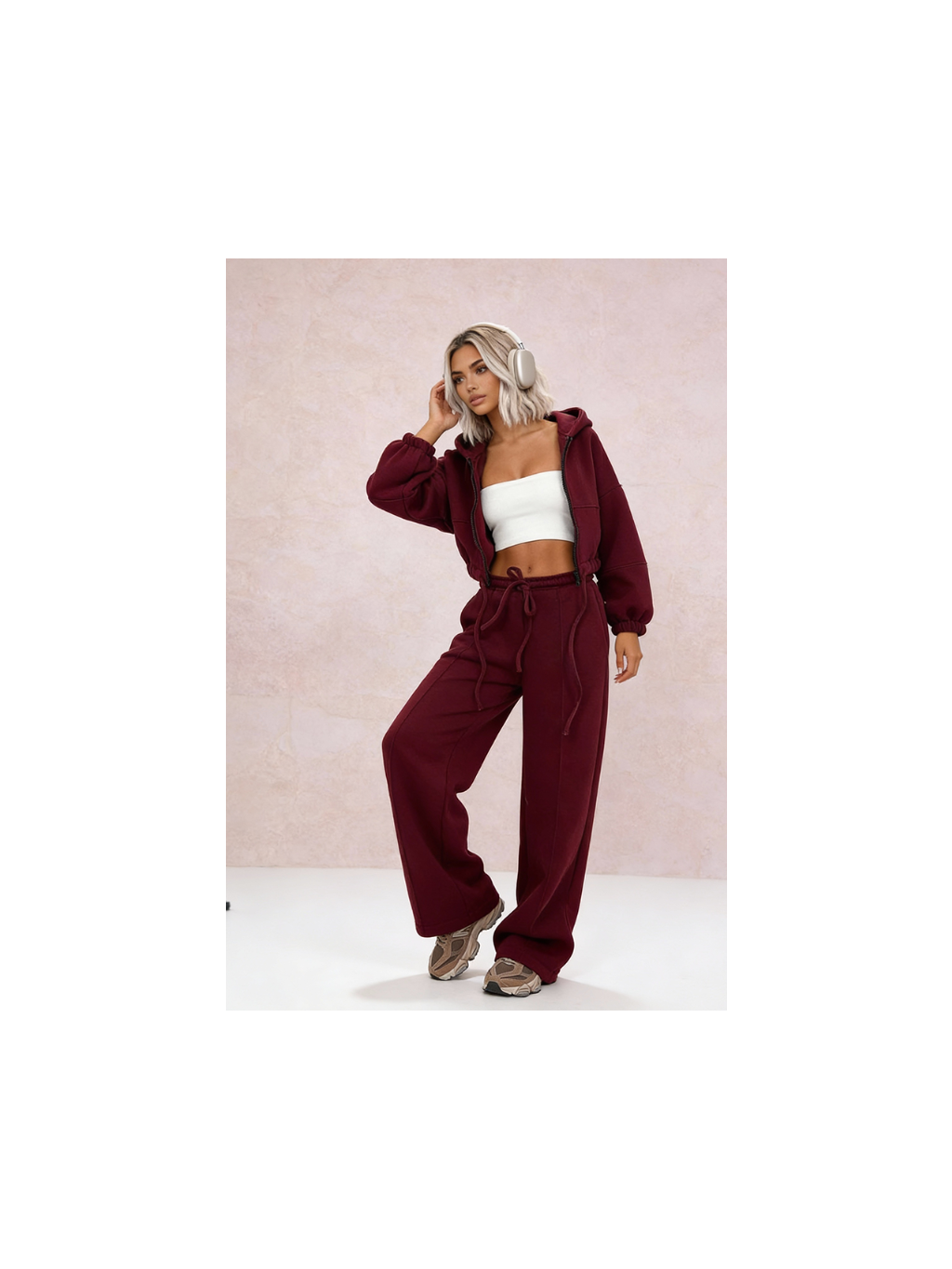 Tepláková souprava NY obsahuje jednoduché, oversized kalhoty se stahovací šňůrkou a prošíváním a oversized mikinu na zip se stahovacími šňůrkami. Výrazný basic kousek, který se hodí ke všemu!