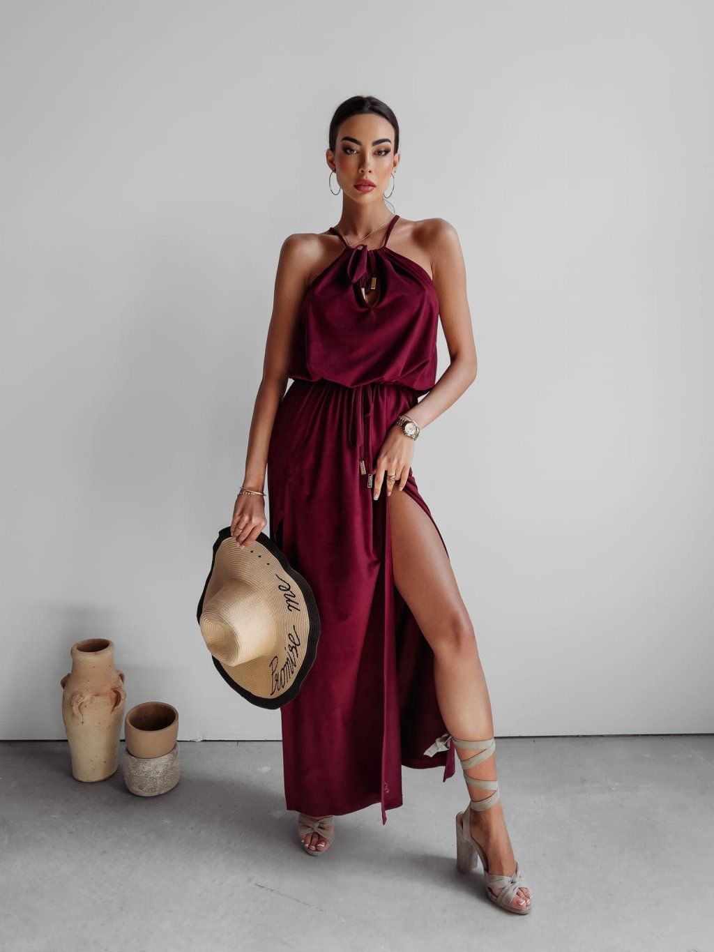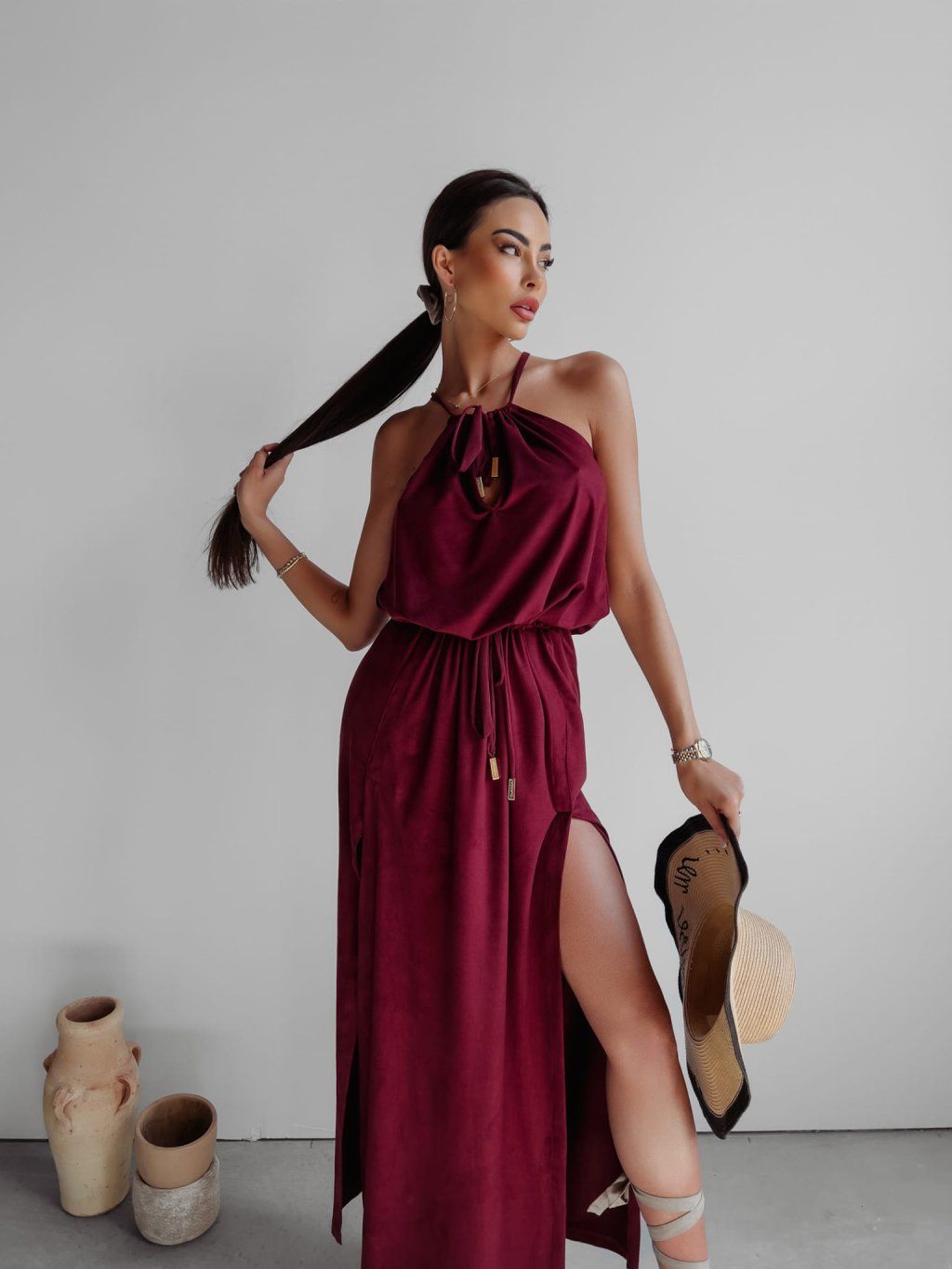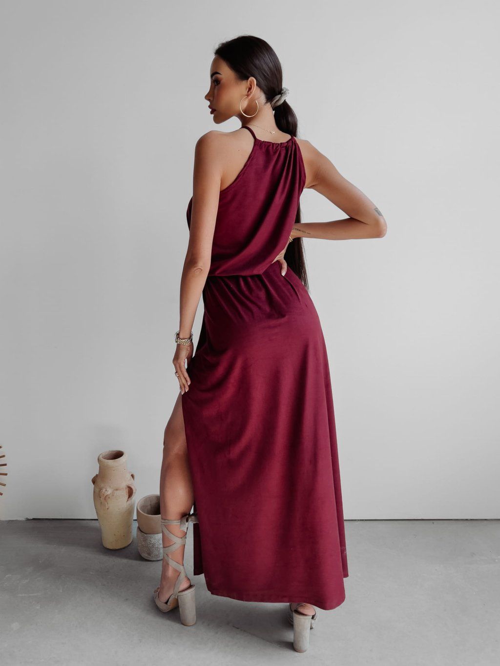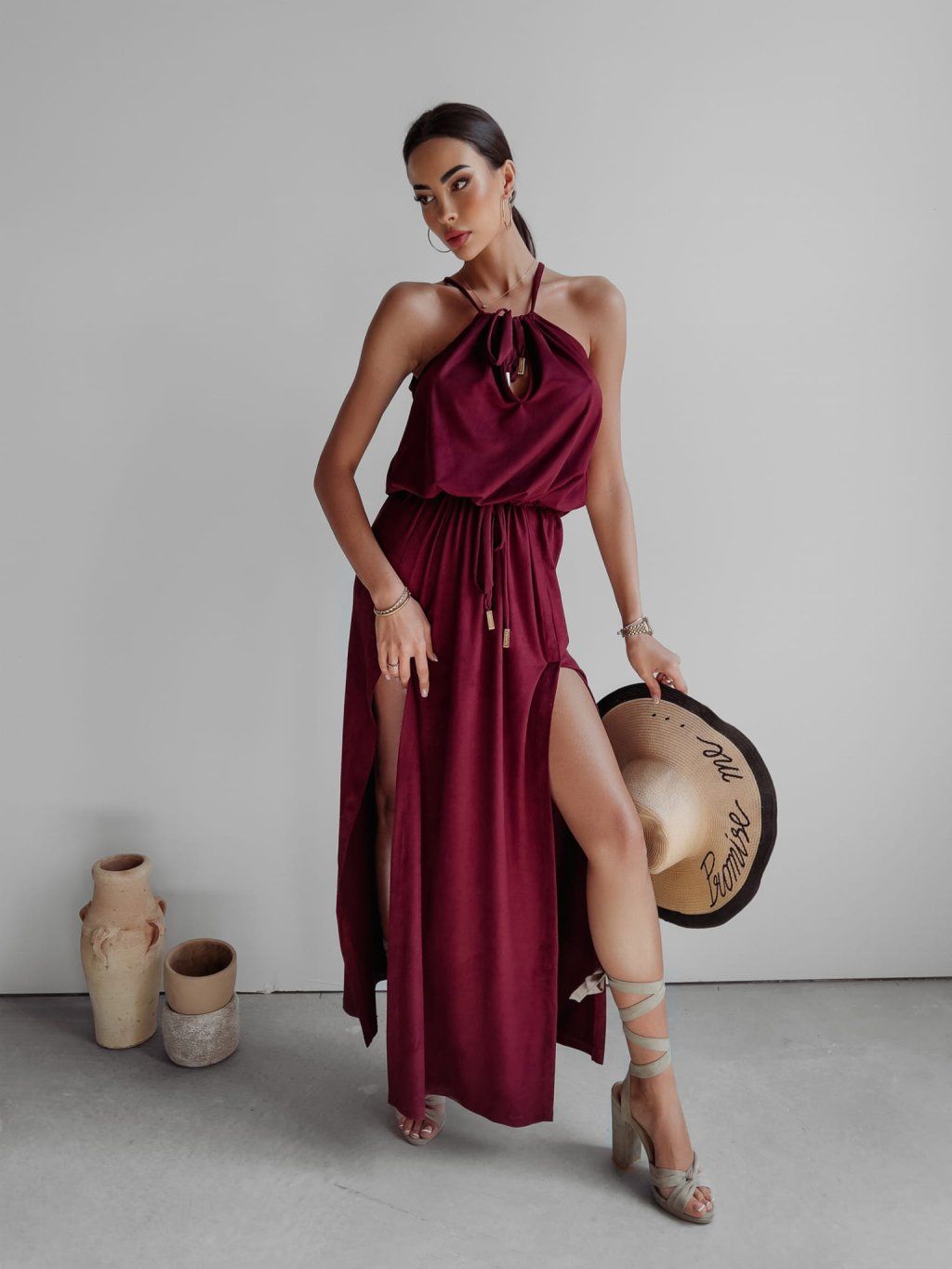 Maxi šaty s hlubokými rozparky, vyrobené z nejkvalitnější semišové látky. Rozparky zeštíhlují postavu a maximálně prodlužují nohy. Dvojité zavazování u krku a v pase umožňuje přiléhavý střih.