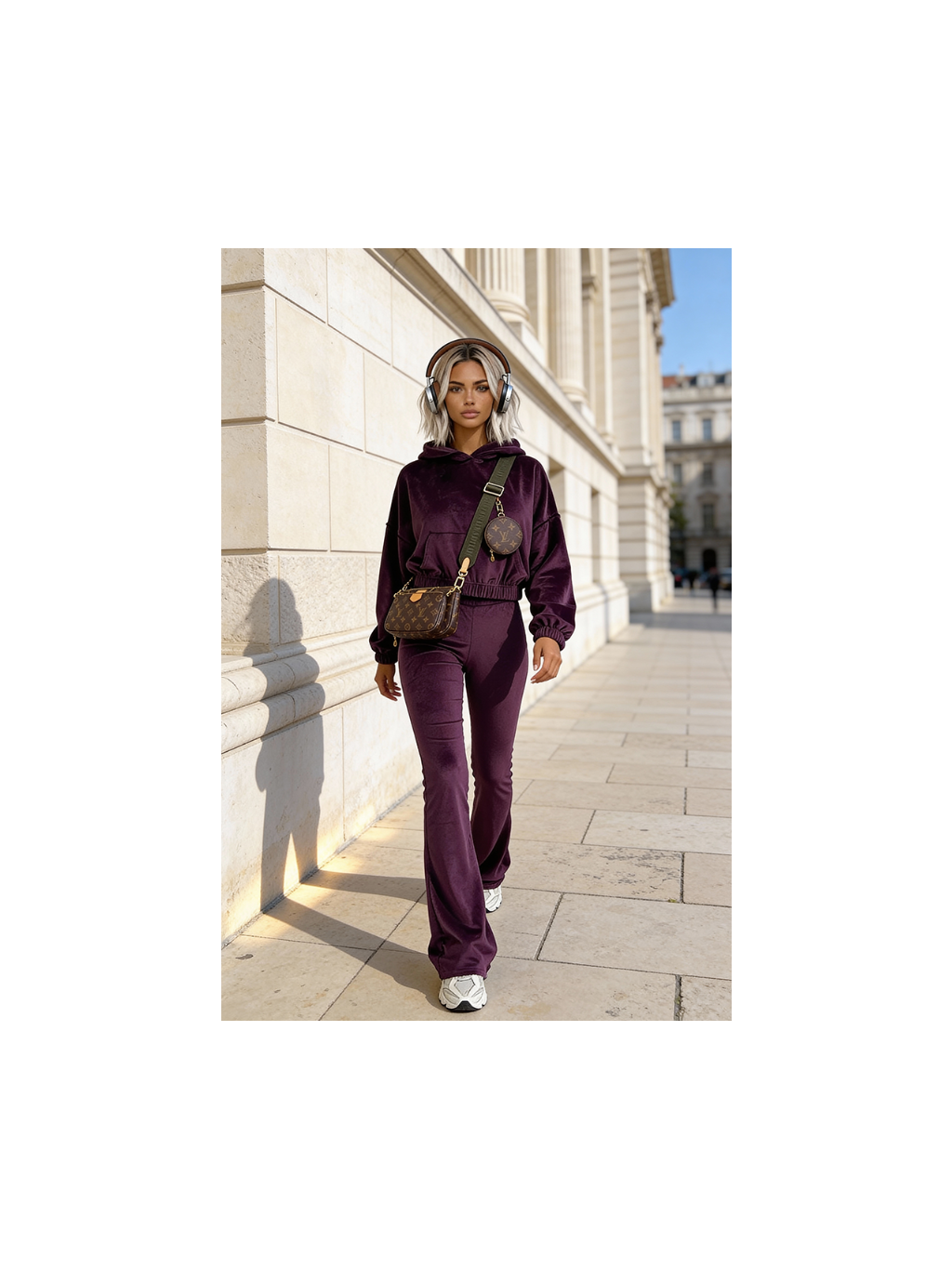 Objevte sadu, která kombinuje každodenní pohodlí s módním designem. Měkká mikina s kapucí a zvonové kalhoty vyrobené z vysoce kvalitního veluru jsou dokonalou kombinací pohodlí a ženského střihu. Jemný lesk materiálu dodává luxusní nádech, zatímco pružná tkanina zaručuje volnost pohybu po celý den.