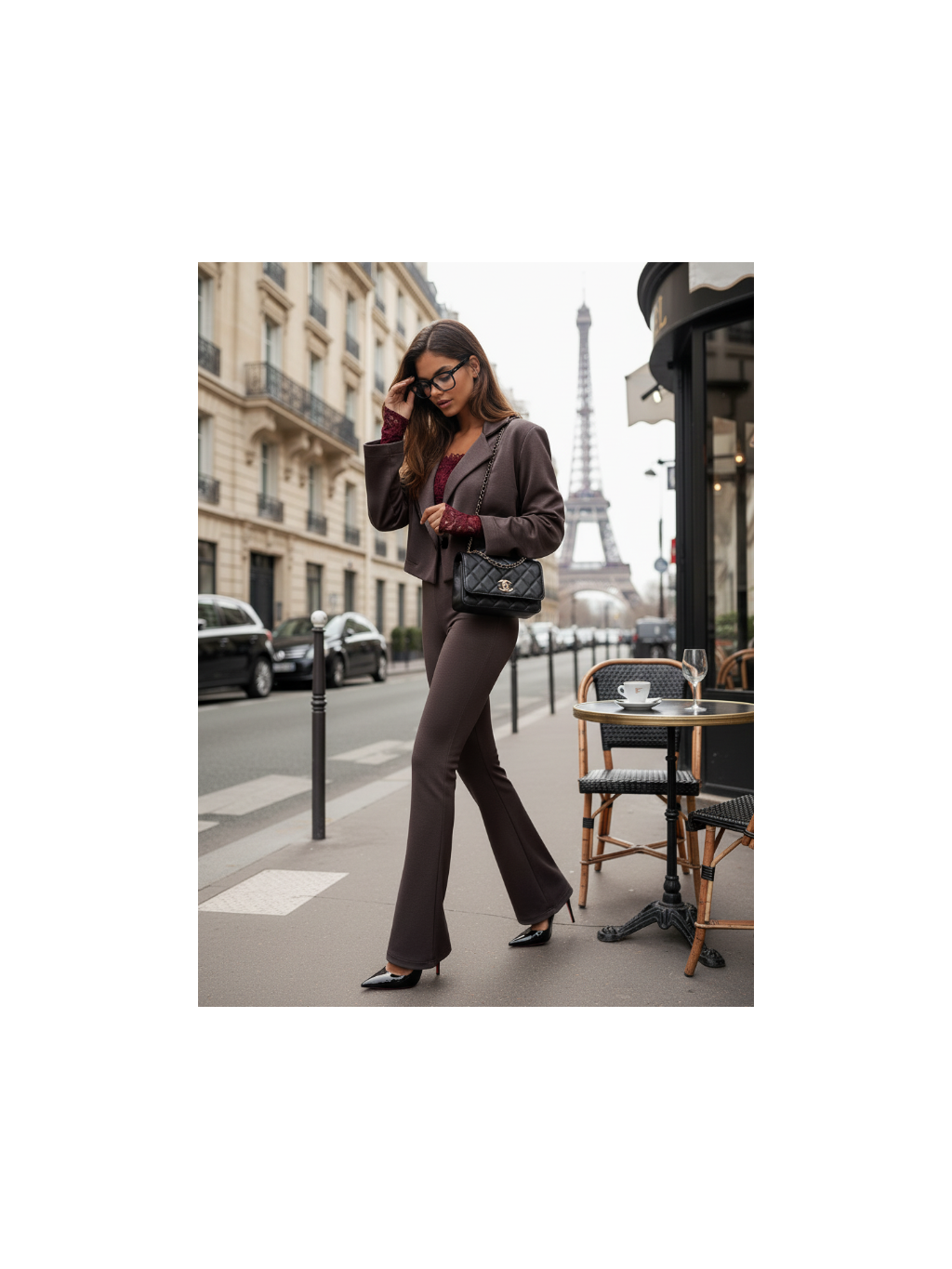Krátké, jemně splývavé sako z viskózy a módní zvonové kalhoty vytvářejí soupravu, která kombinuje naprosté pohodlí s decentní elegancí. Kalhoty jsou vyrobeny z mimořádně měkkého, prémiového viskózového úpletu (tzv. „máslového“) , který se dokonale přizpůsobí postavě.