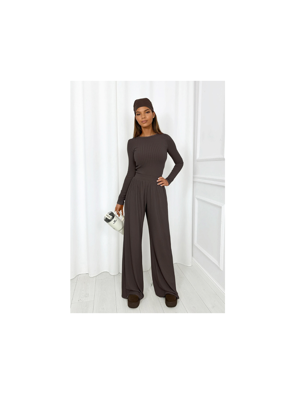 Pletená souprava Wave s žebrovaným vzorem. Souprava, která kombinuje pohodlí, lehkost a módní, ležérní styl. Lehce splývavá žebrovaná látka krásně splývá s postavou a zdůrazňuje její přirozené linie.