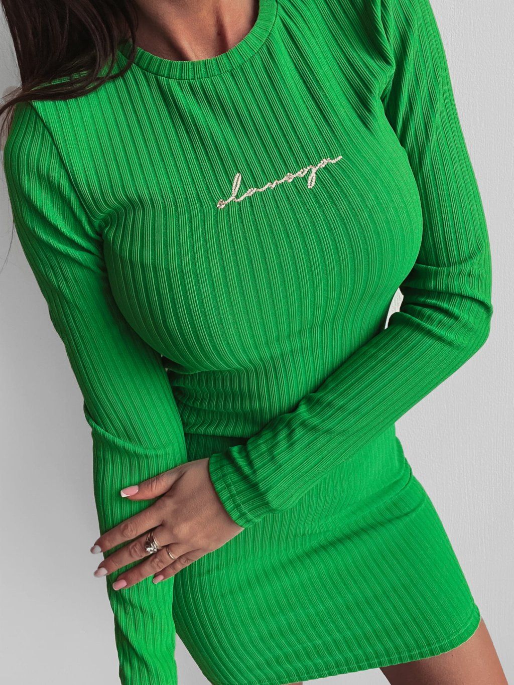 Přiléhavé pletené šaty nad kolena, které dokonale zdůrazní ženské křivky. Mají dlouhé rukávy a rovný výstřih. Decentní výšivka na přední straně. Ideální pro obchodní schůzku nebo večerní rande.